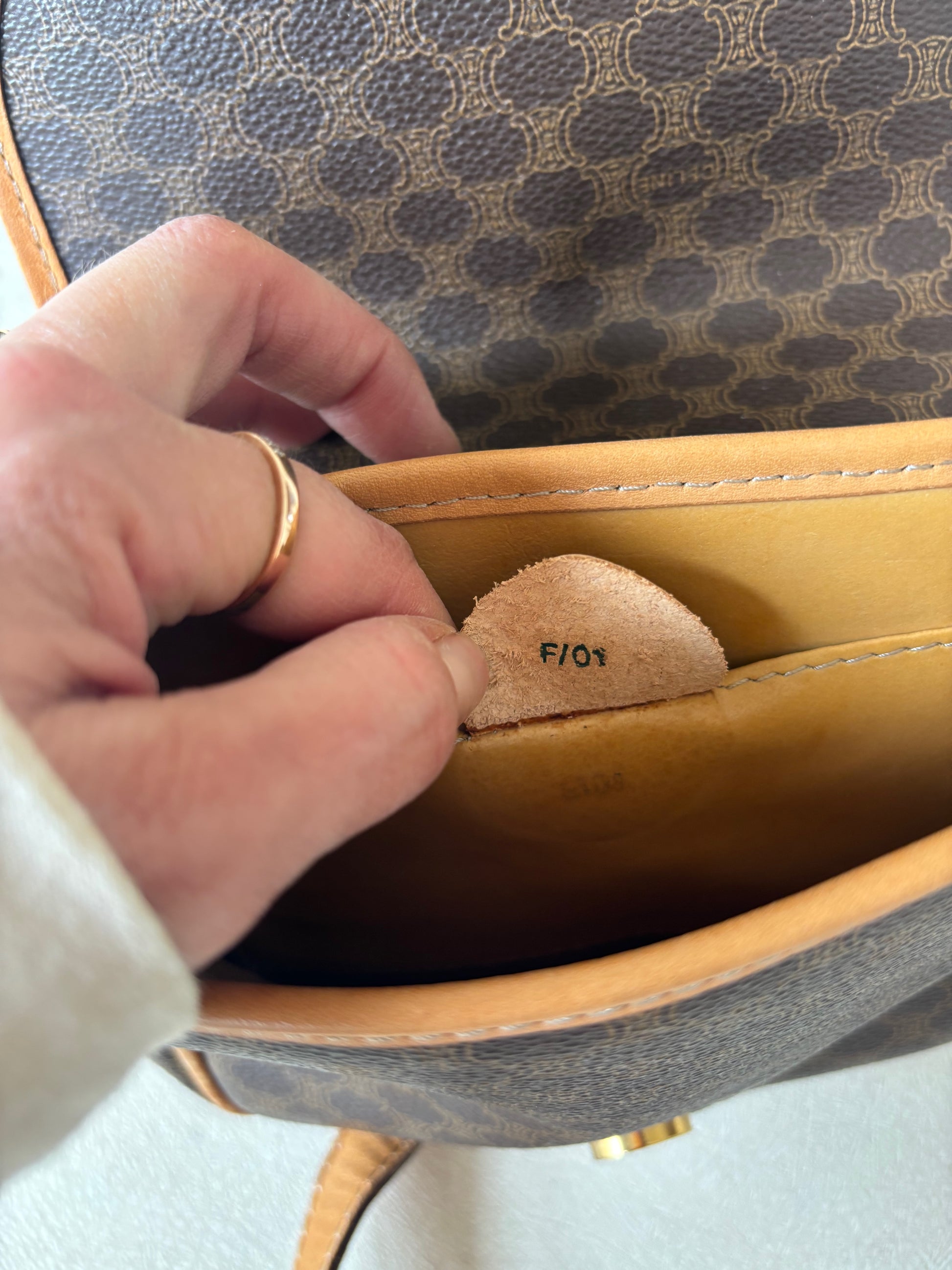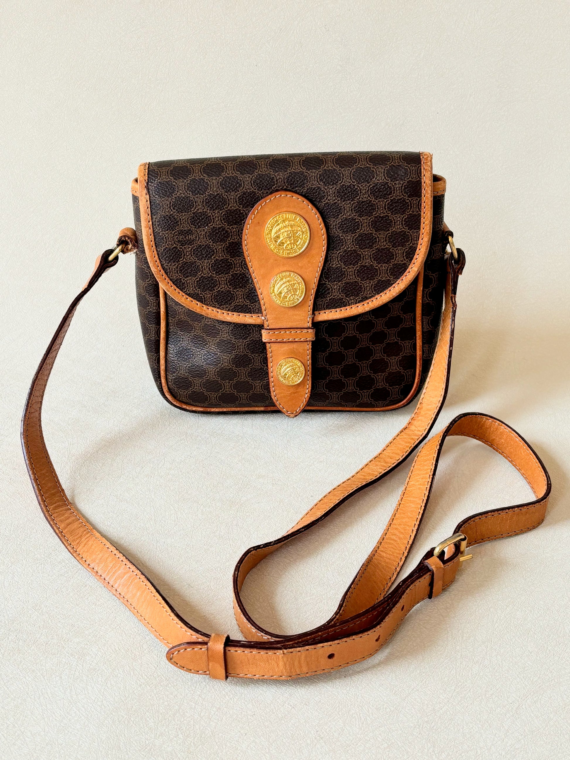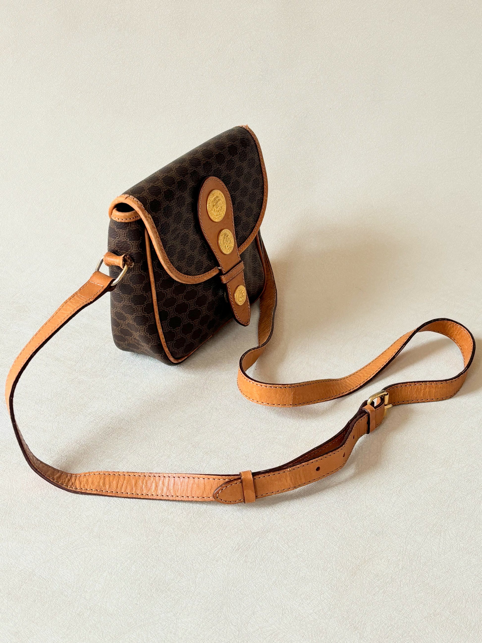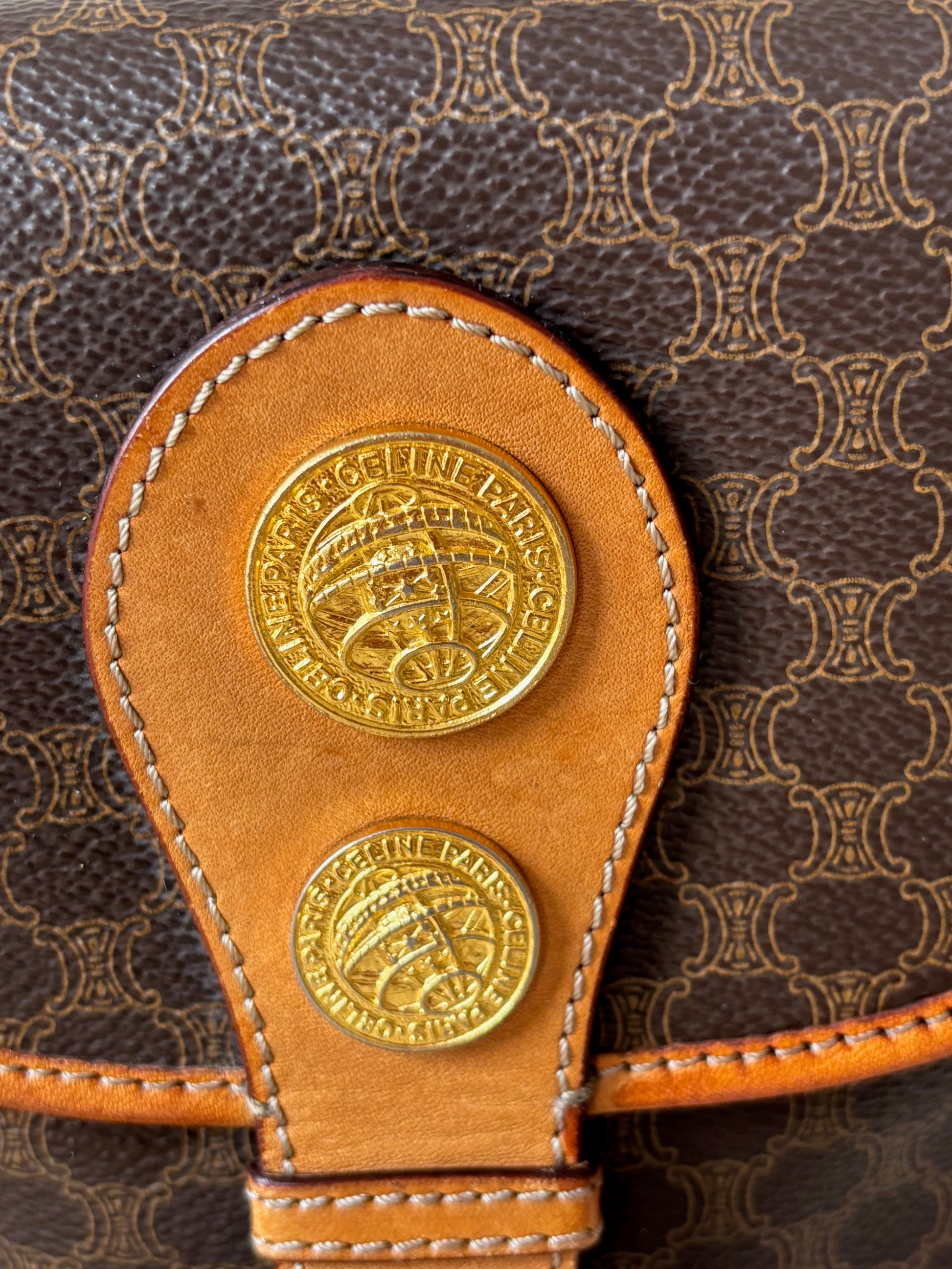 * Fermoir en cuir camel, orné de 3 médaillons dorés siglés