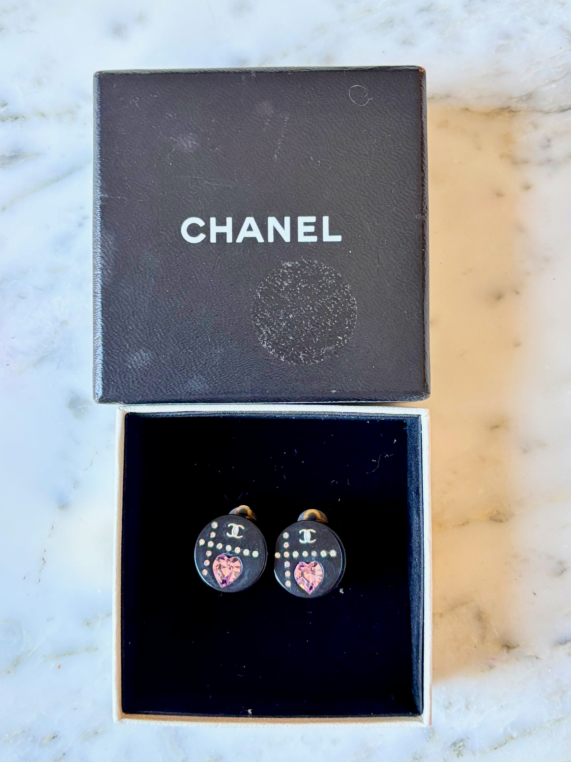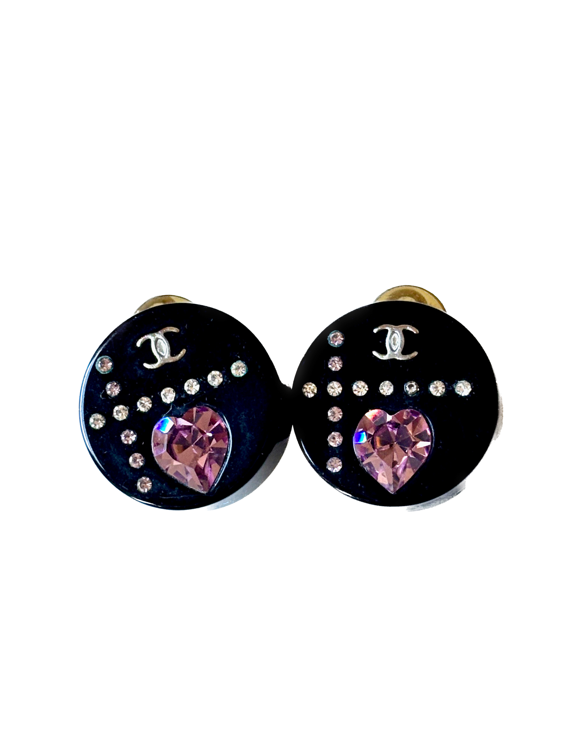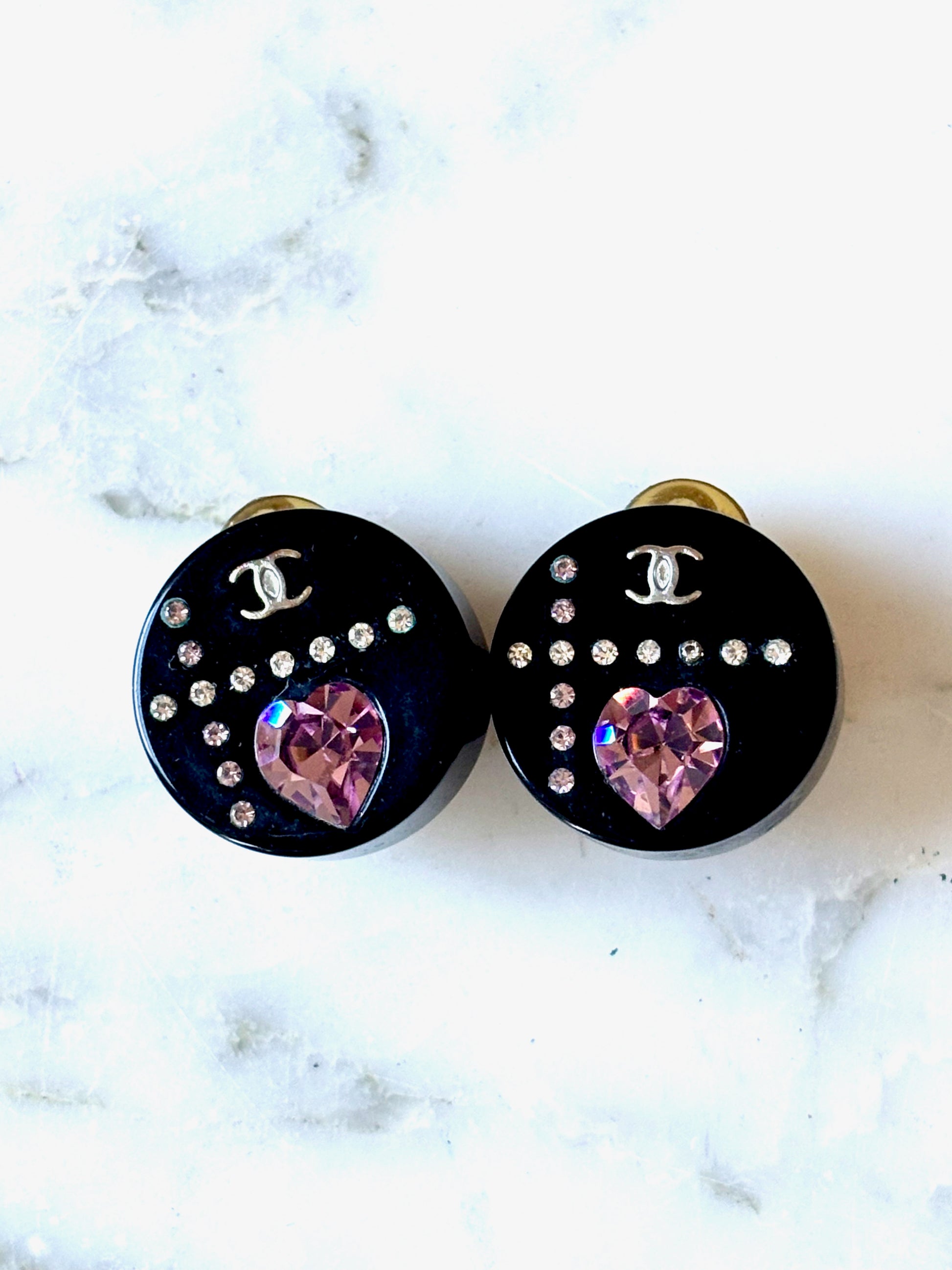 * En céramique noir avec logo CC en métal argenté, incrustée de strass et d'un coeur rose