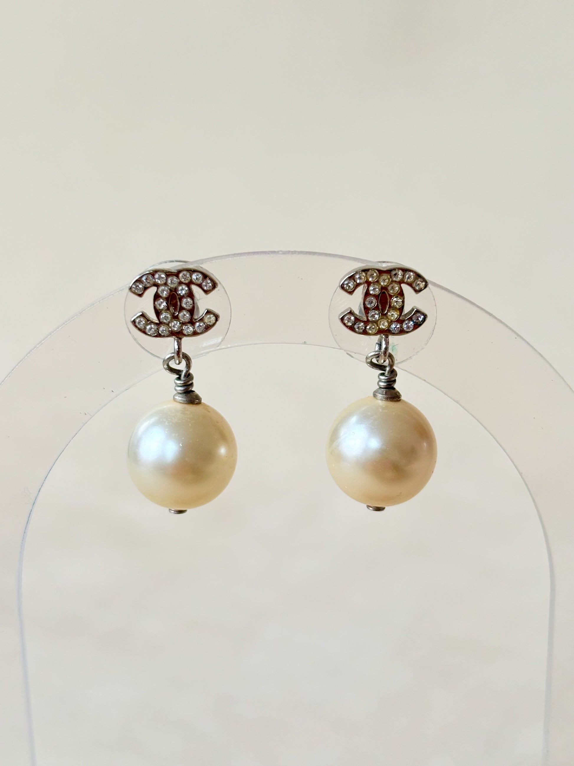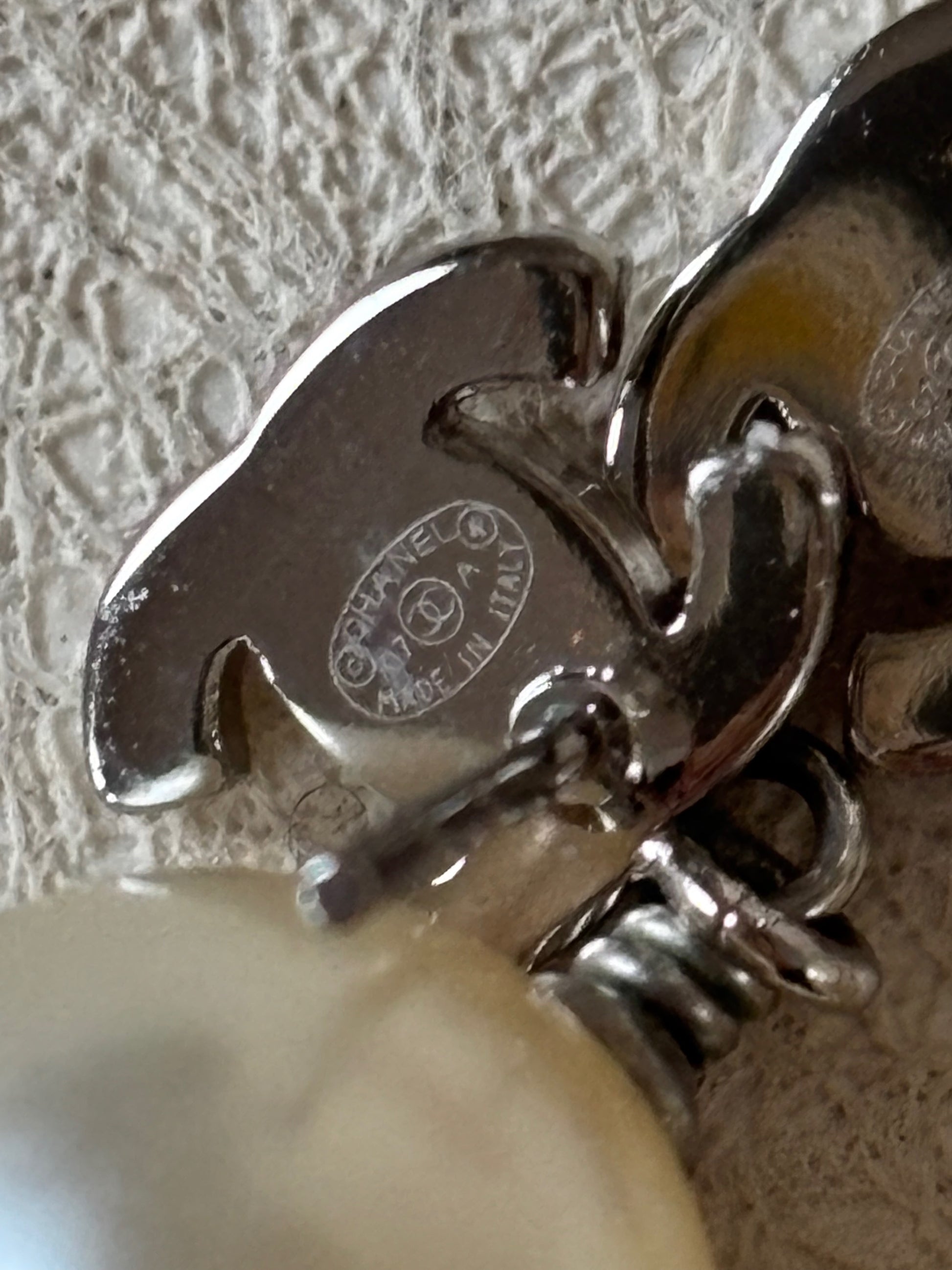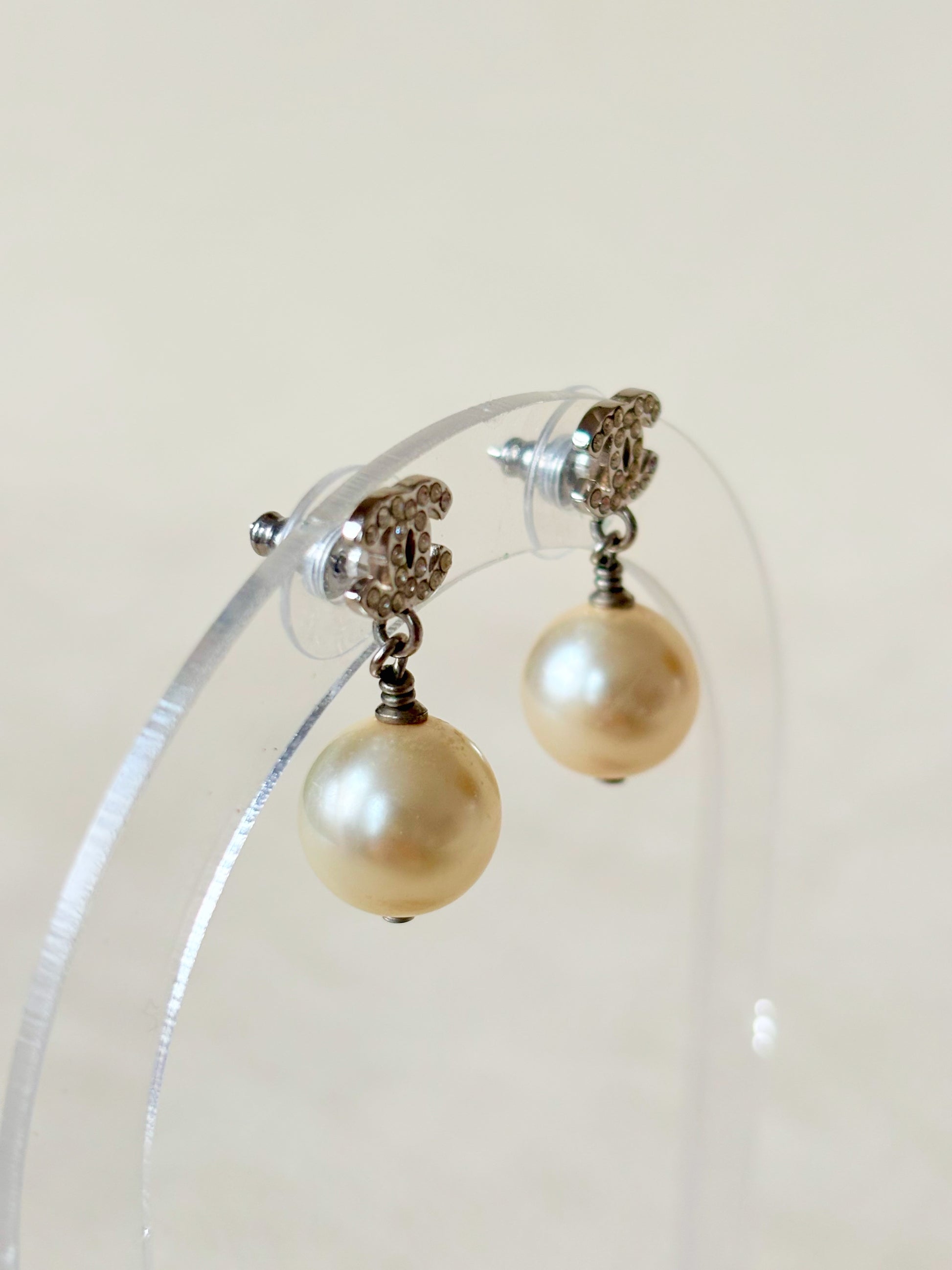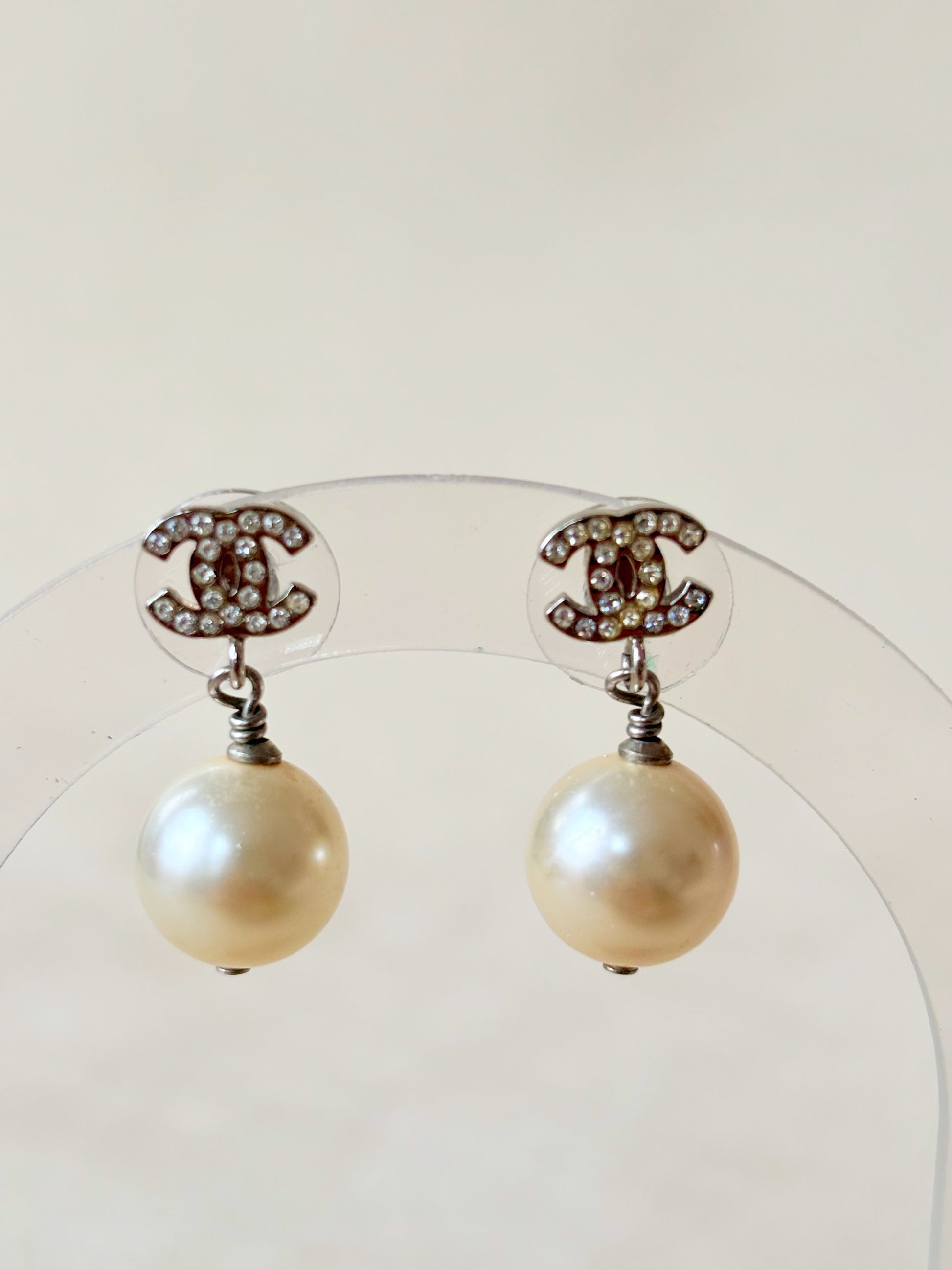 * Logo CC en métal argenté, incrusté de strass, et perle nacrée pendante