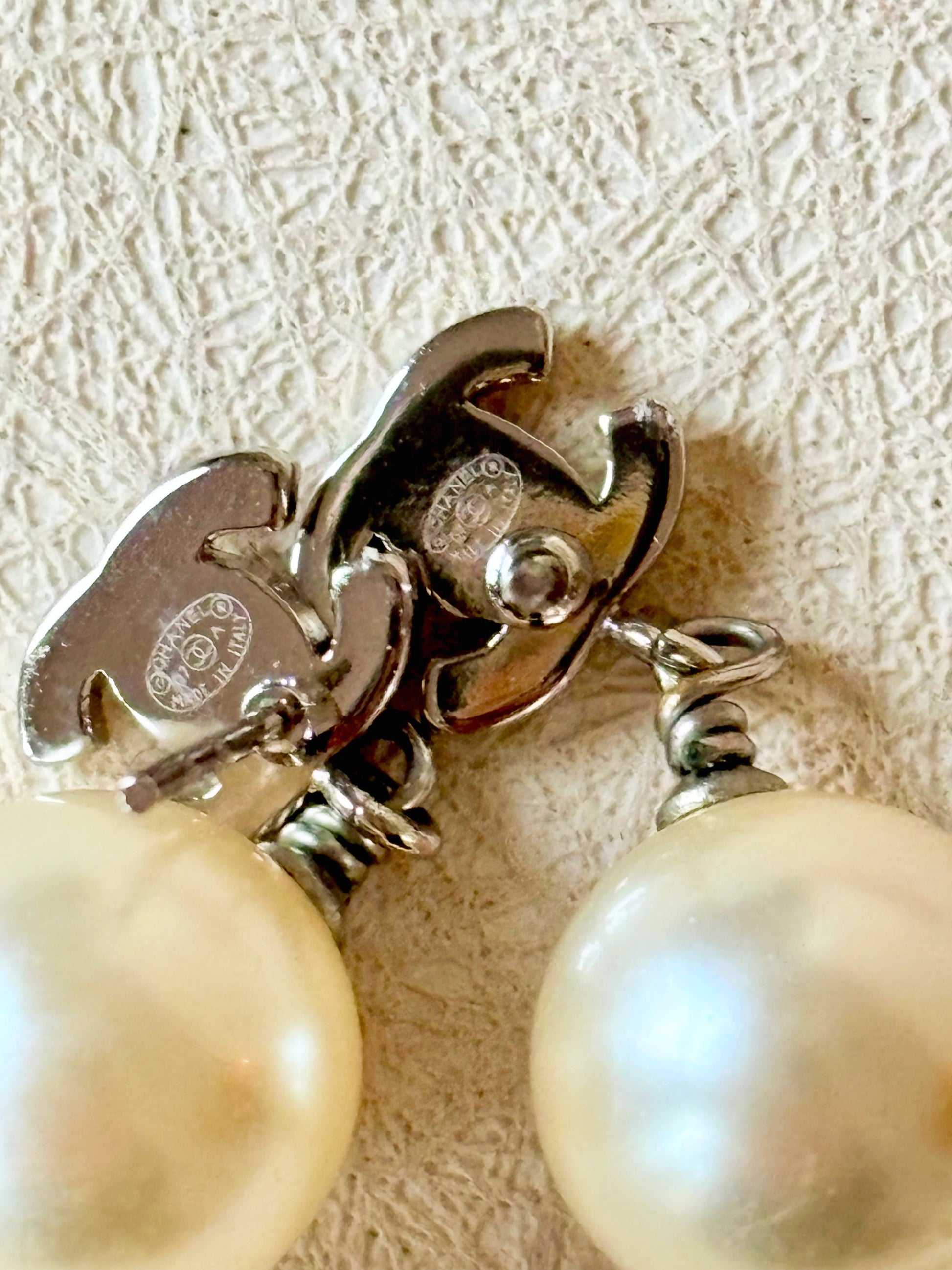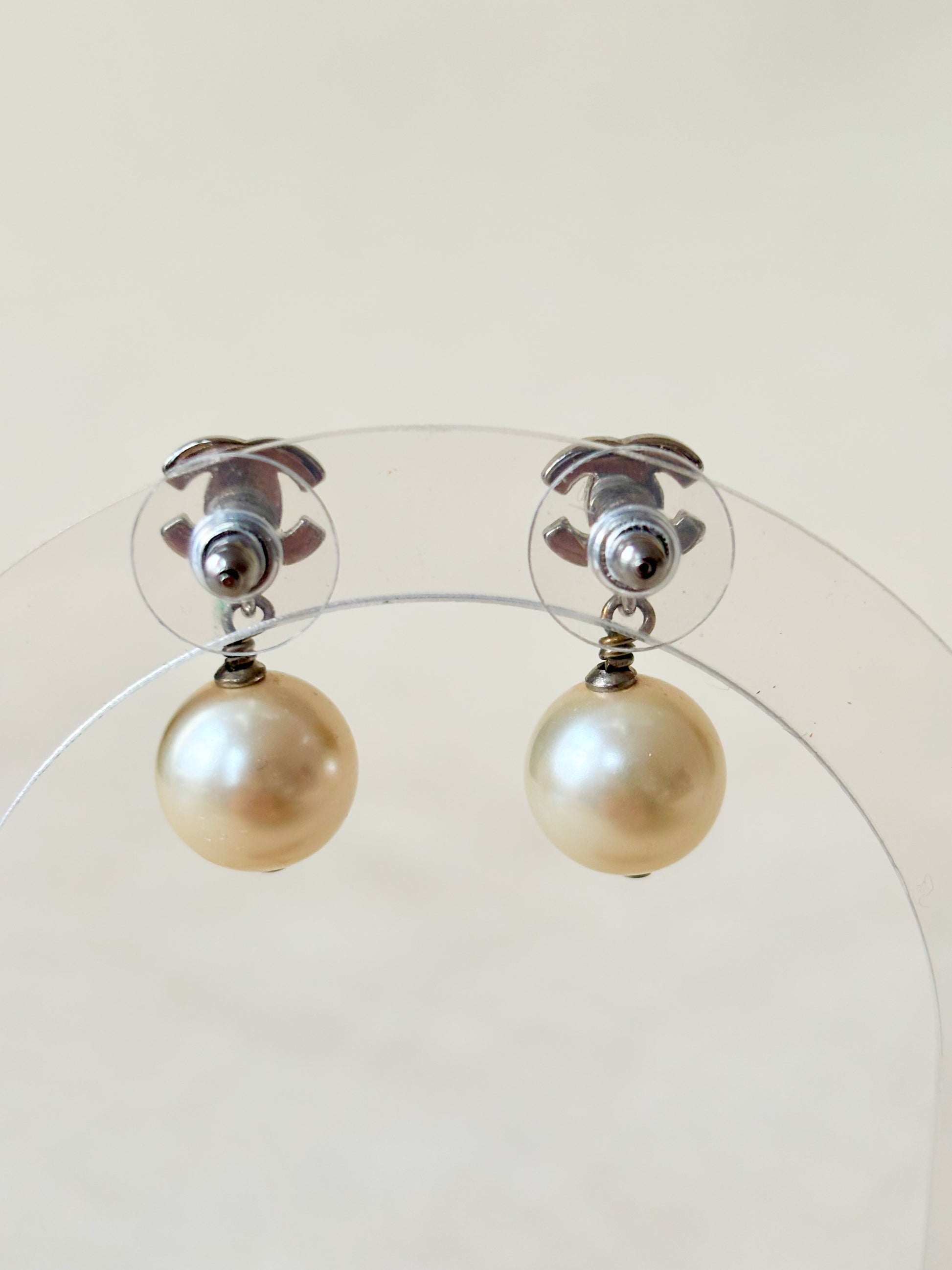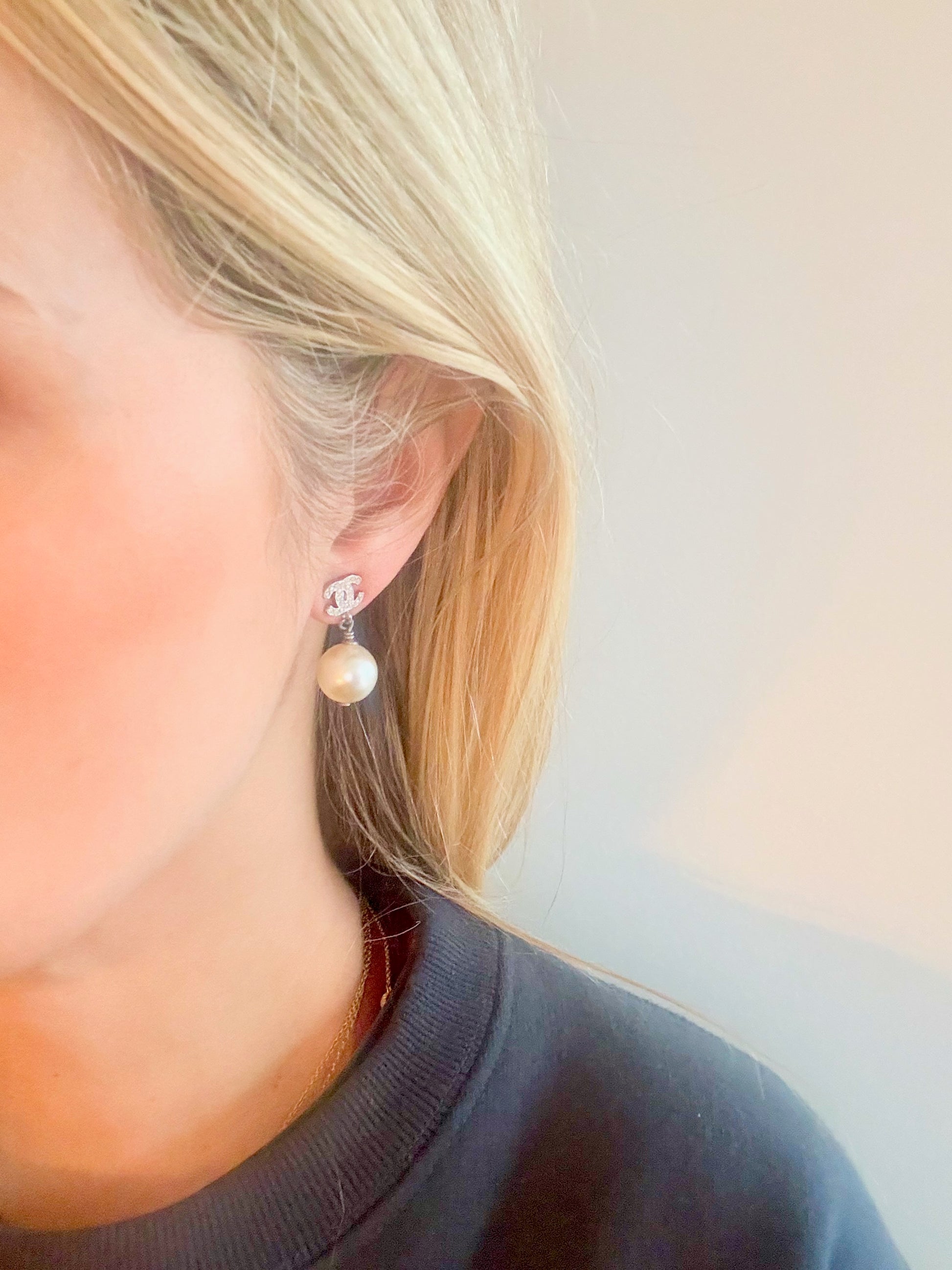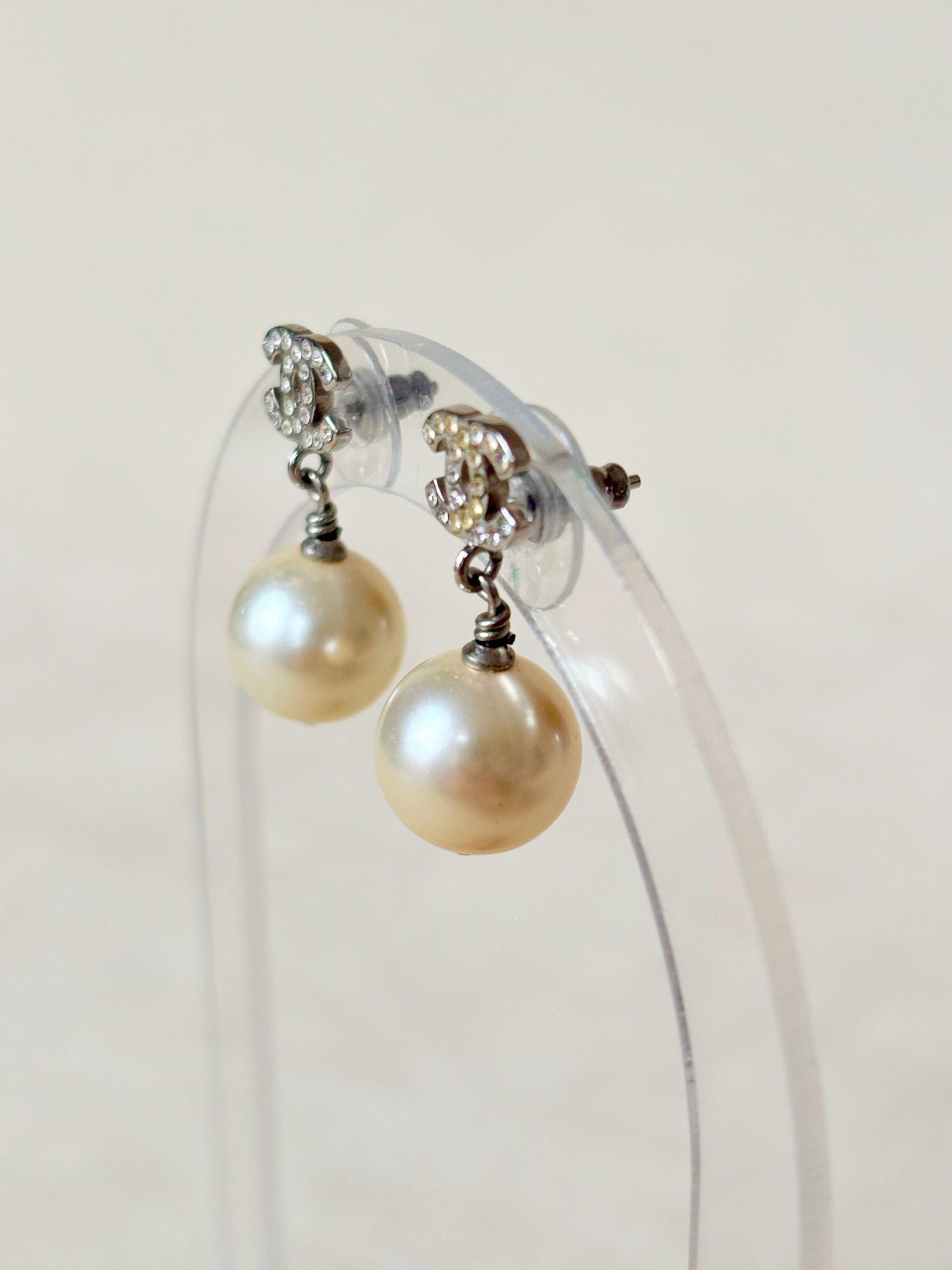 * Logo CC en métal argenté, incrusté de strass, et perle nacrée pendante