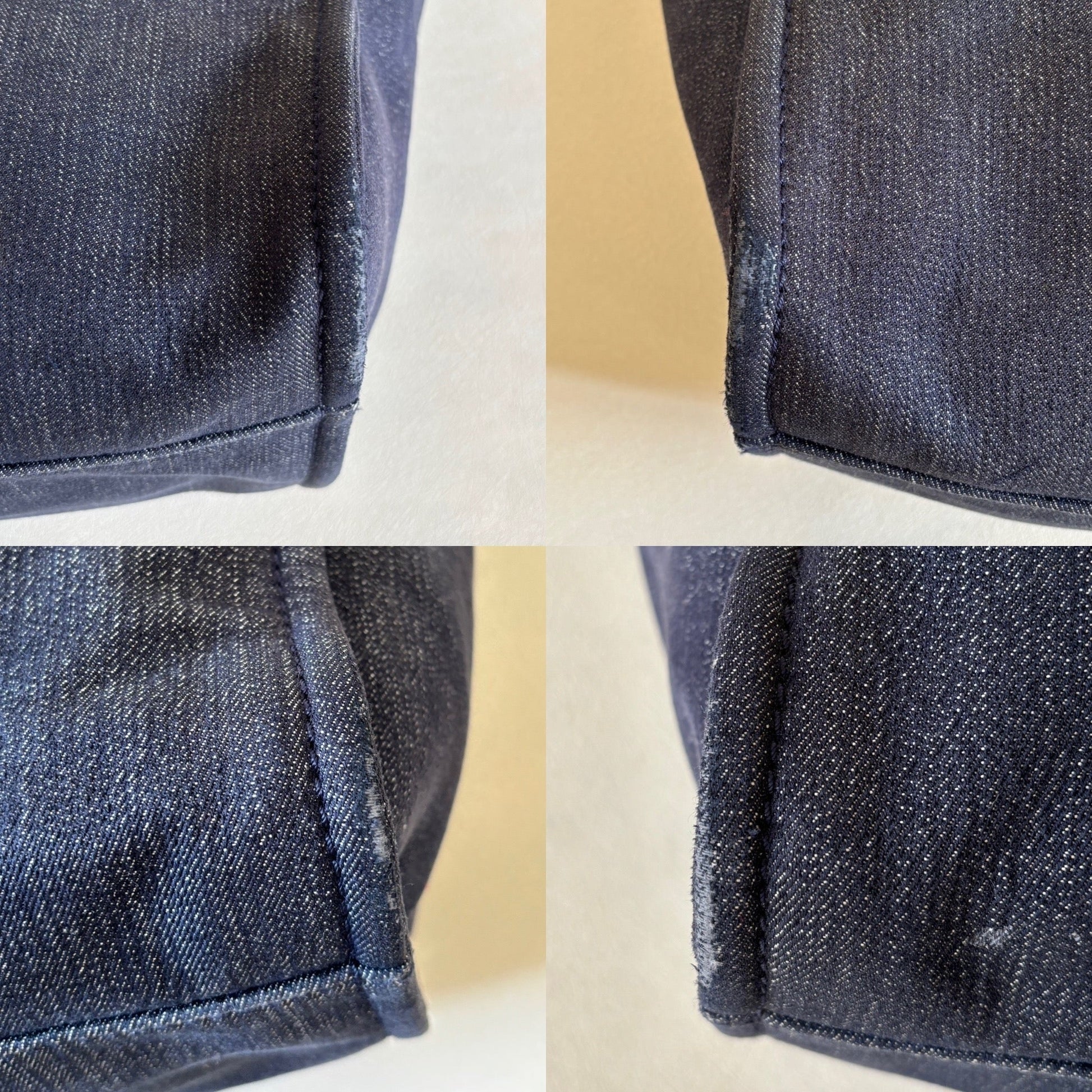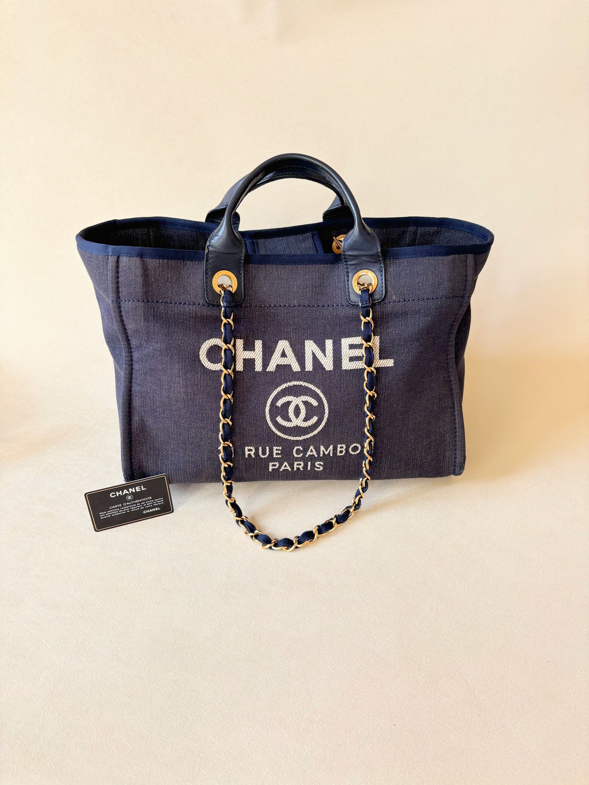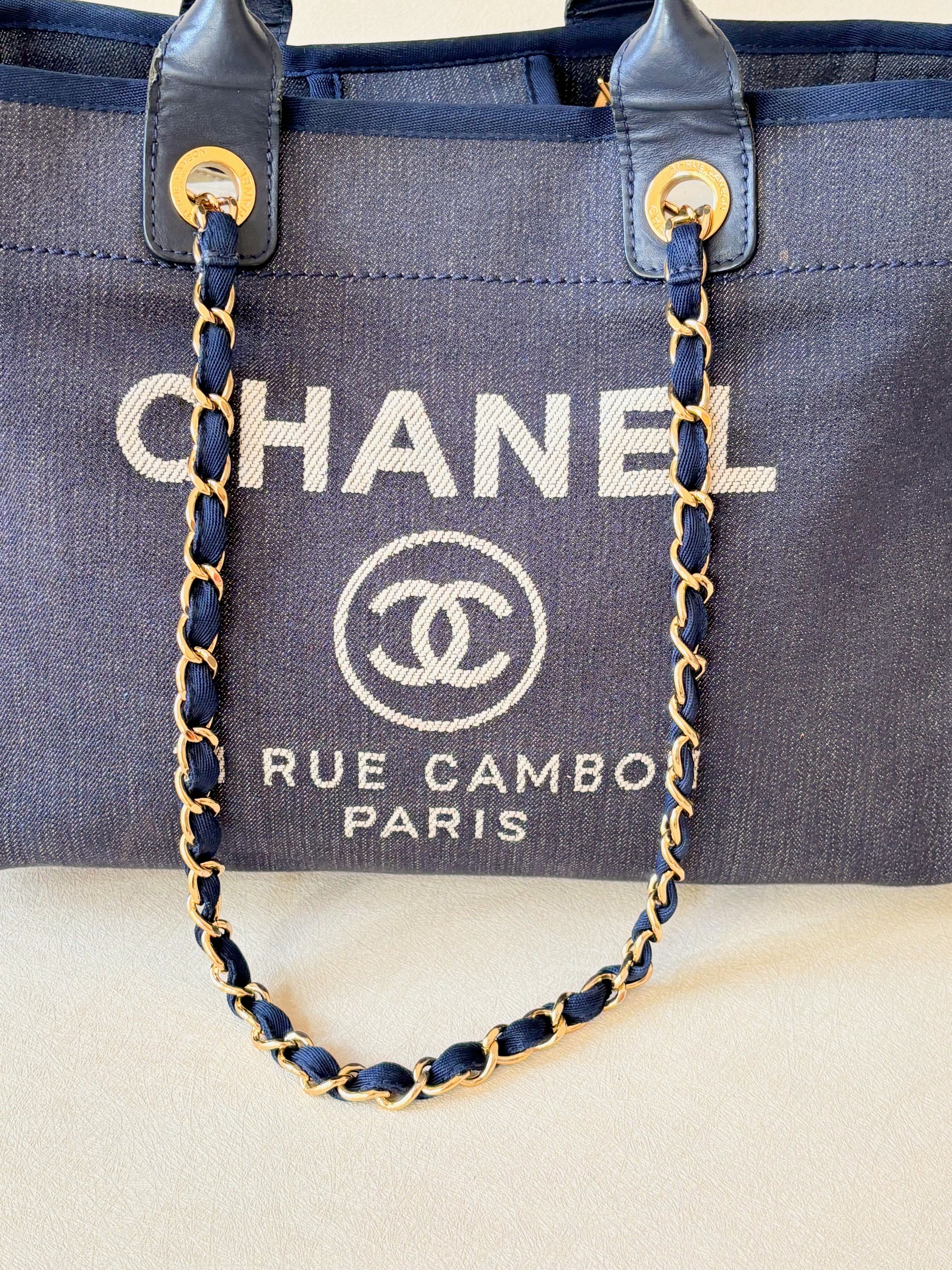 * Chaîne en métal doré entrelacée de denim, pour un porté épaule, et deux anses en cuir marine en parfait état