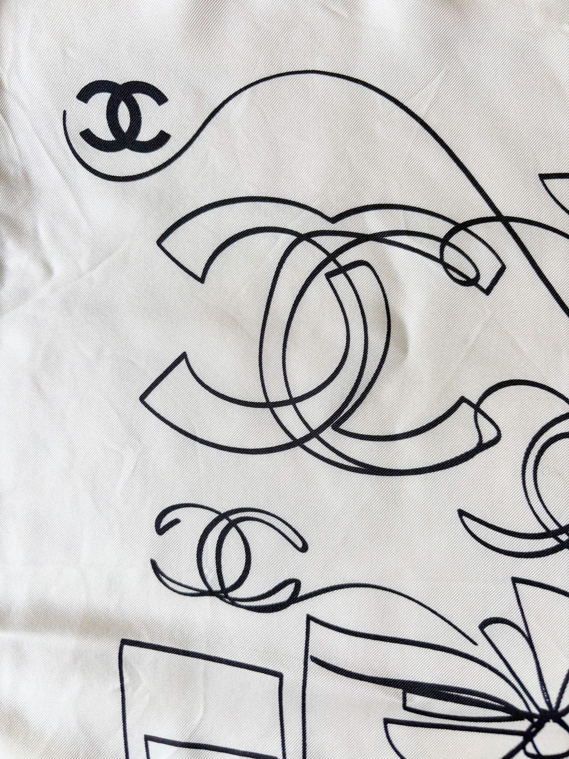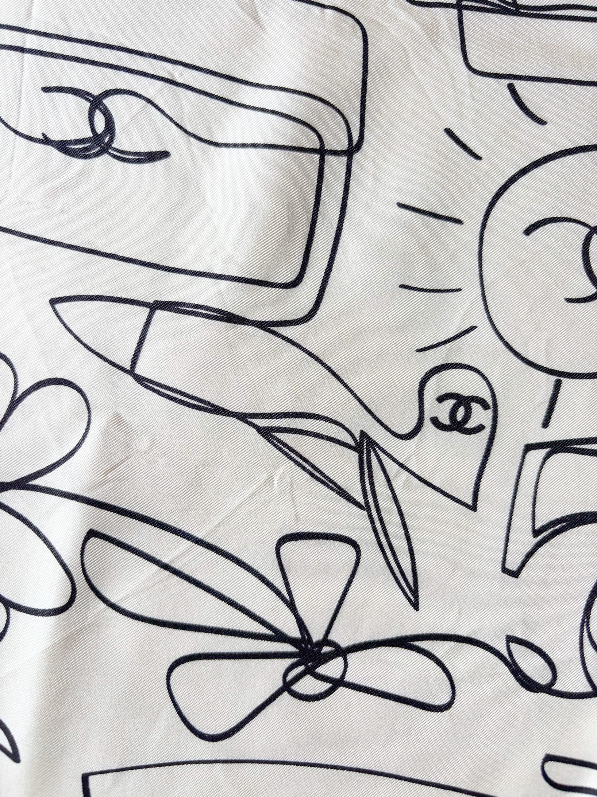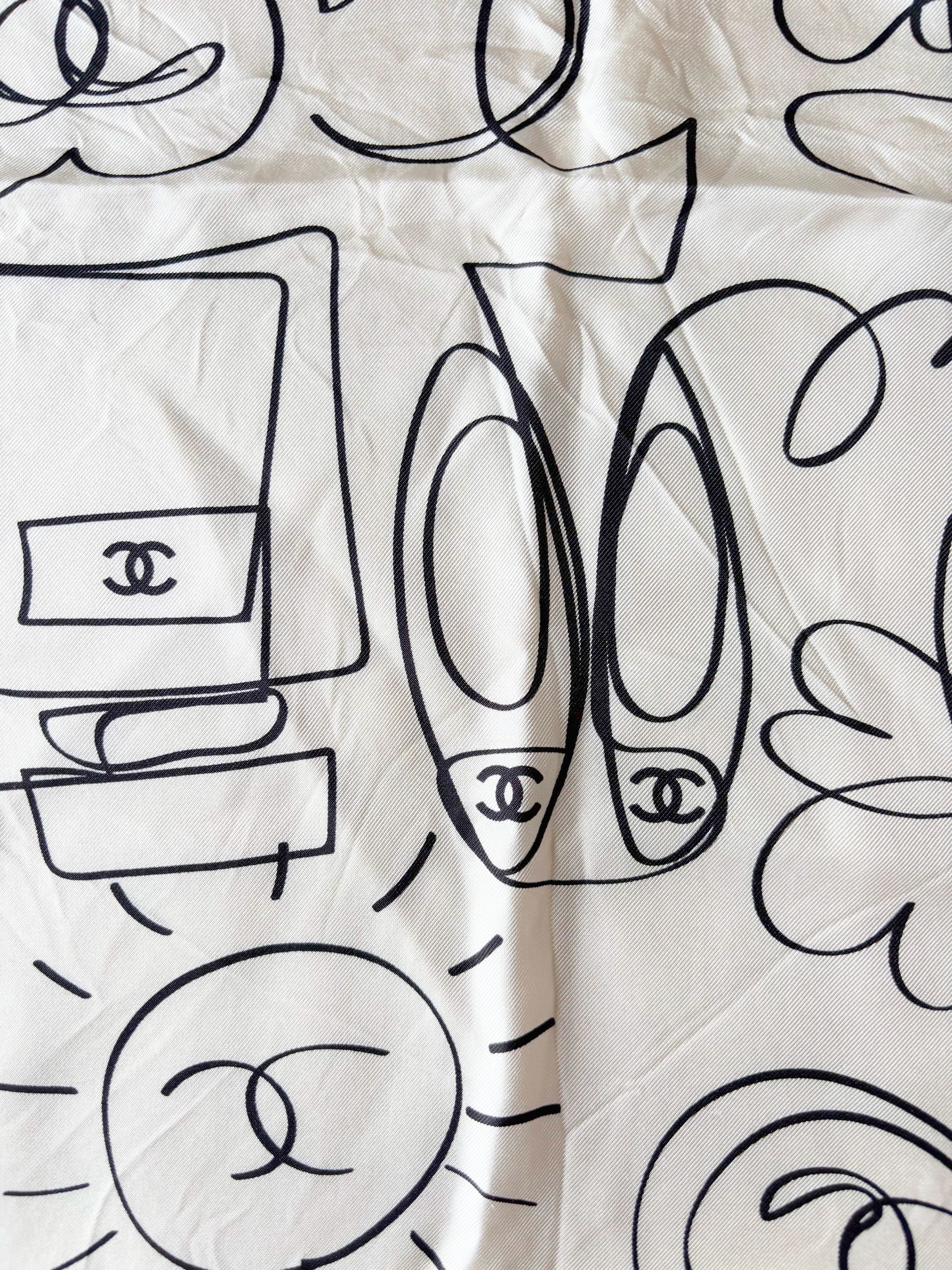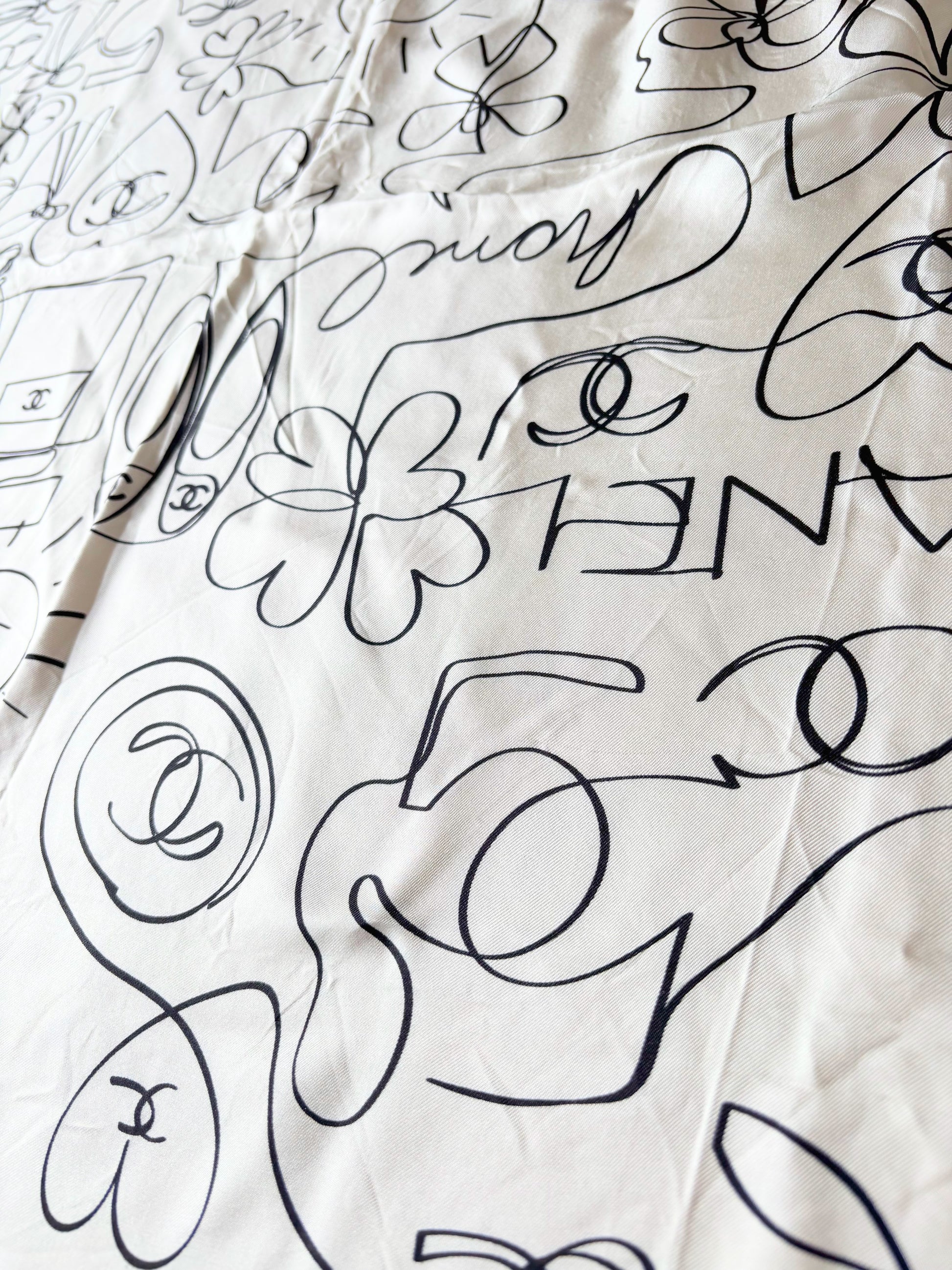 * Motifs icôniques déclinant les emblèmes de la marque dessinés en noir sur fond blanc : le parfum N°5, le sac Timeless, le noeud, le trèfle...