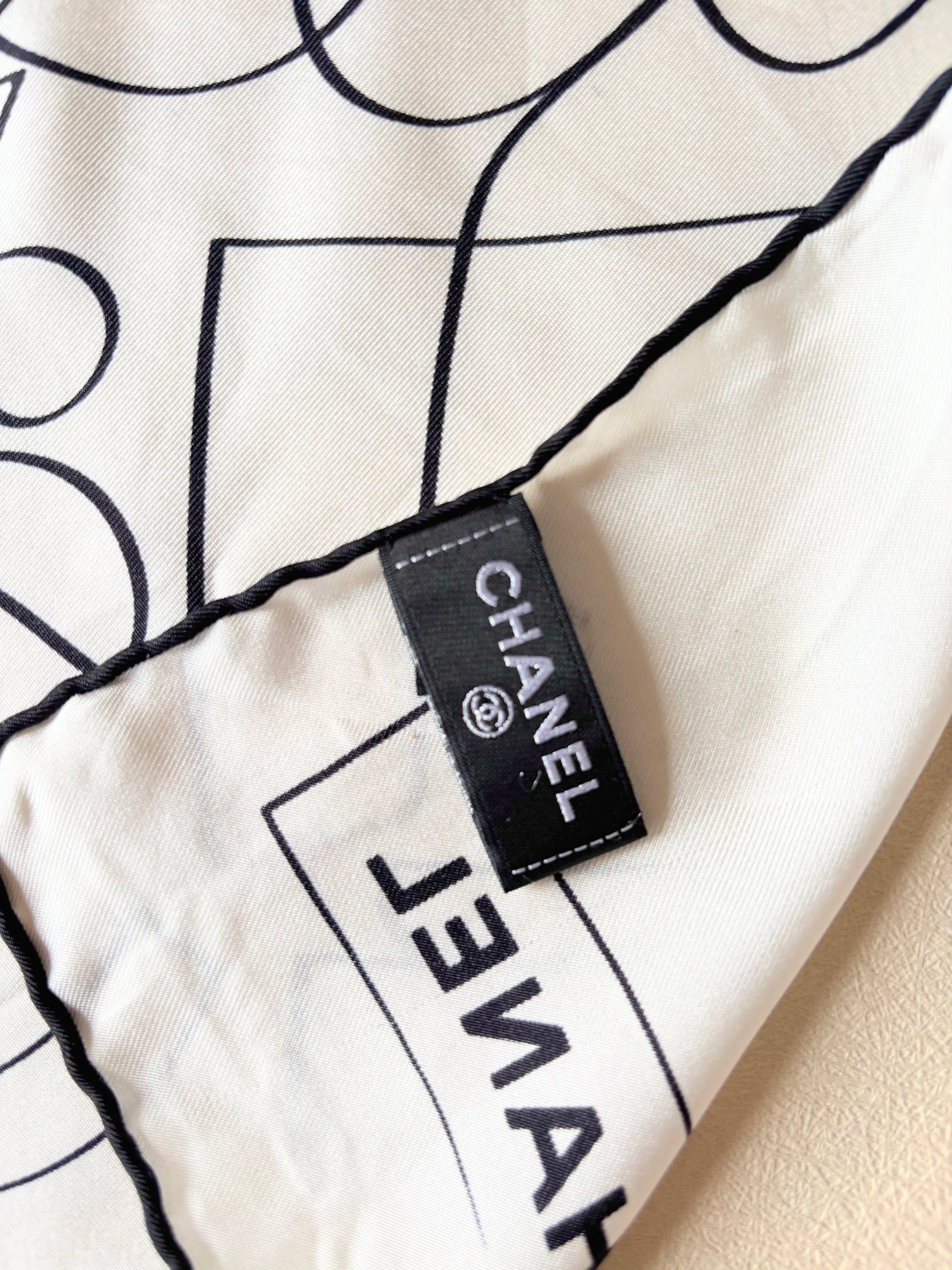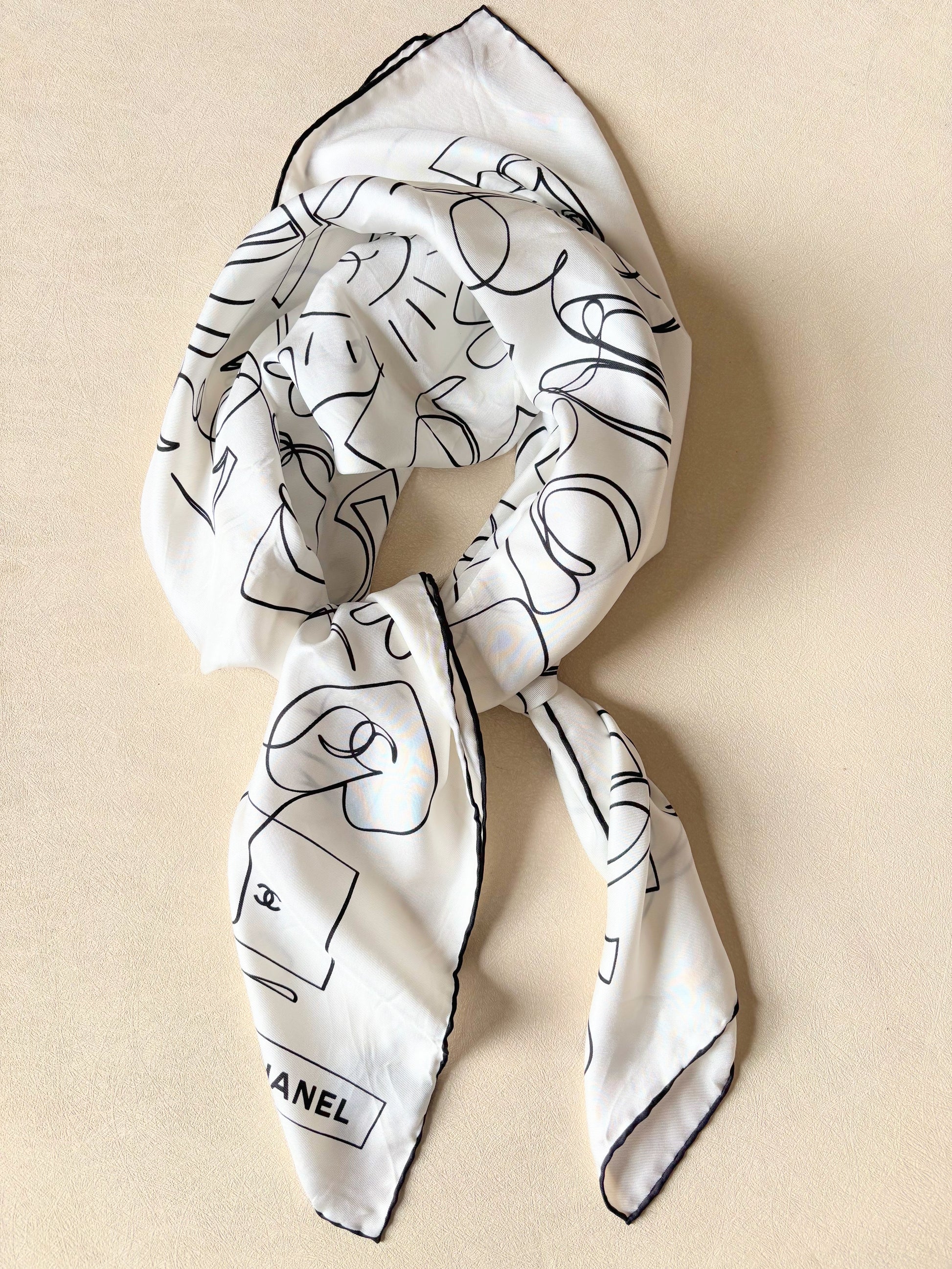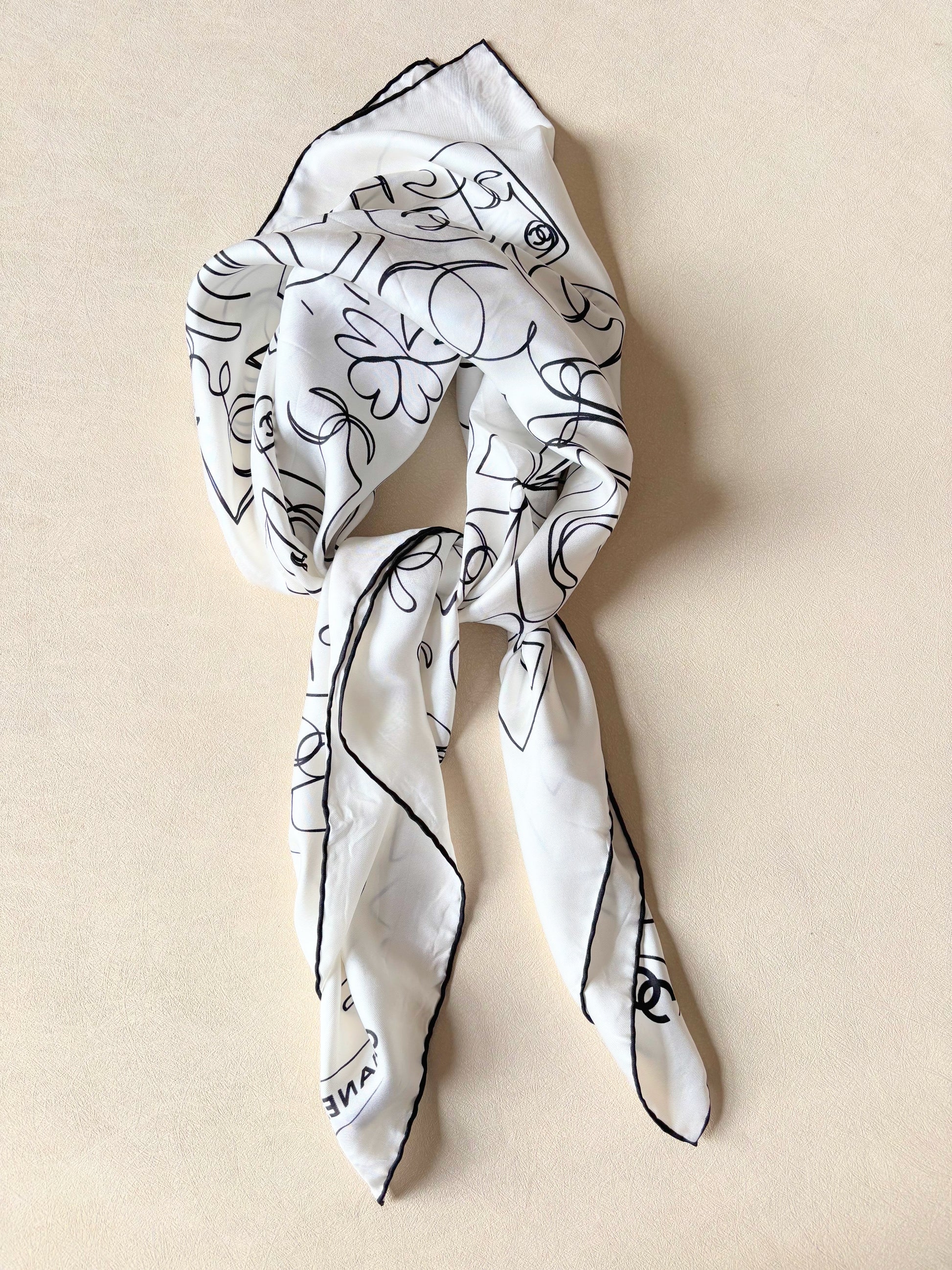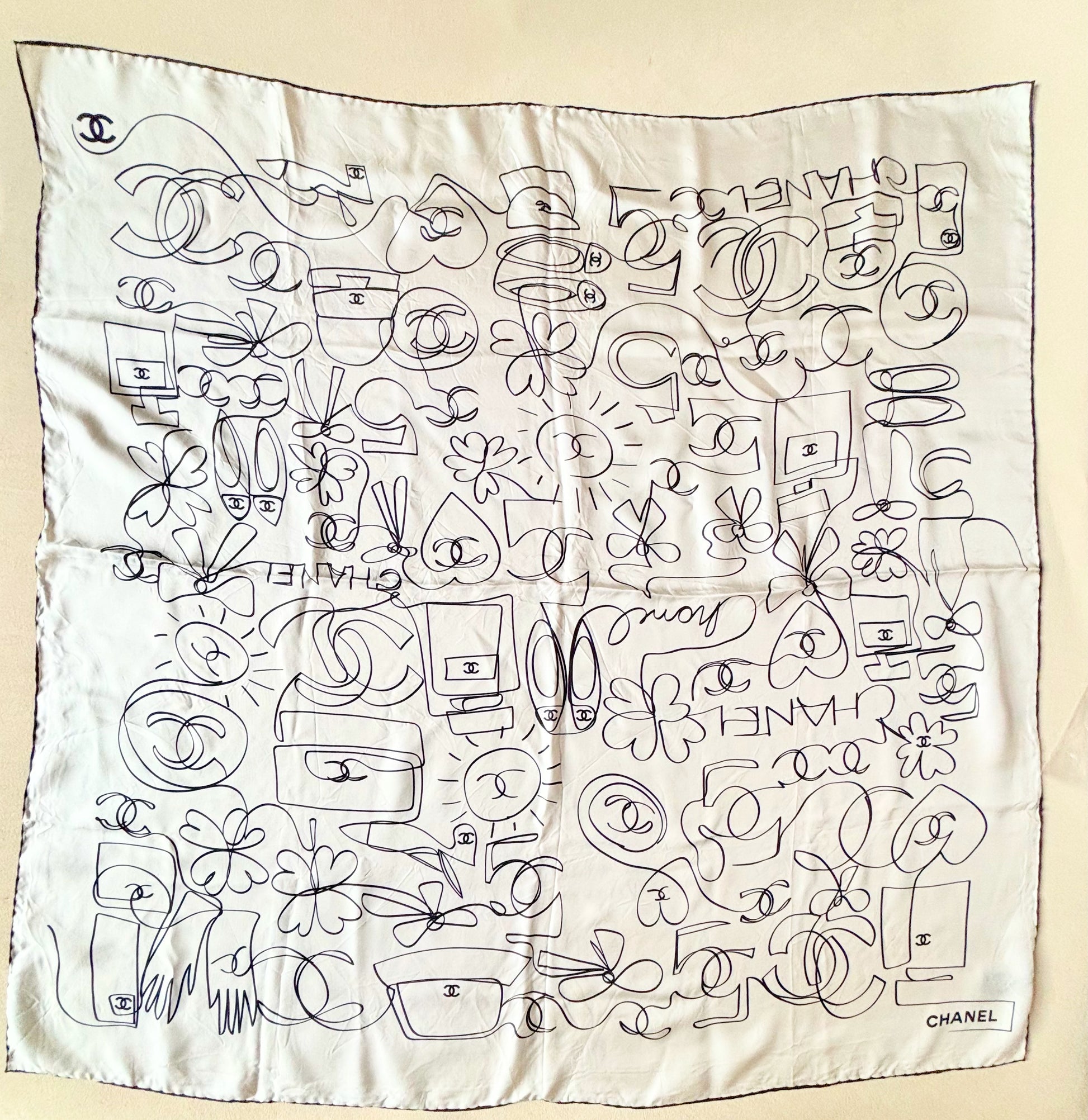* Motifs icôniques déclinant les emblèmes de la marque dessinés en noir sur fond blanc : le parfum N°5, le sac Timeless, le noeud, le trèfle...