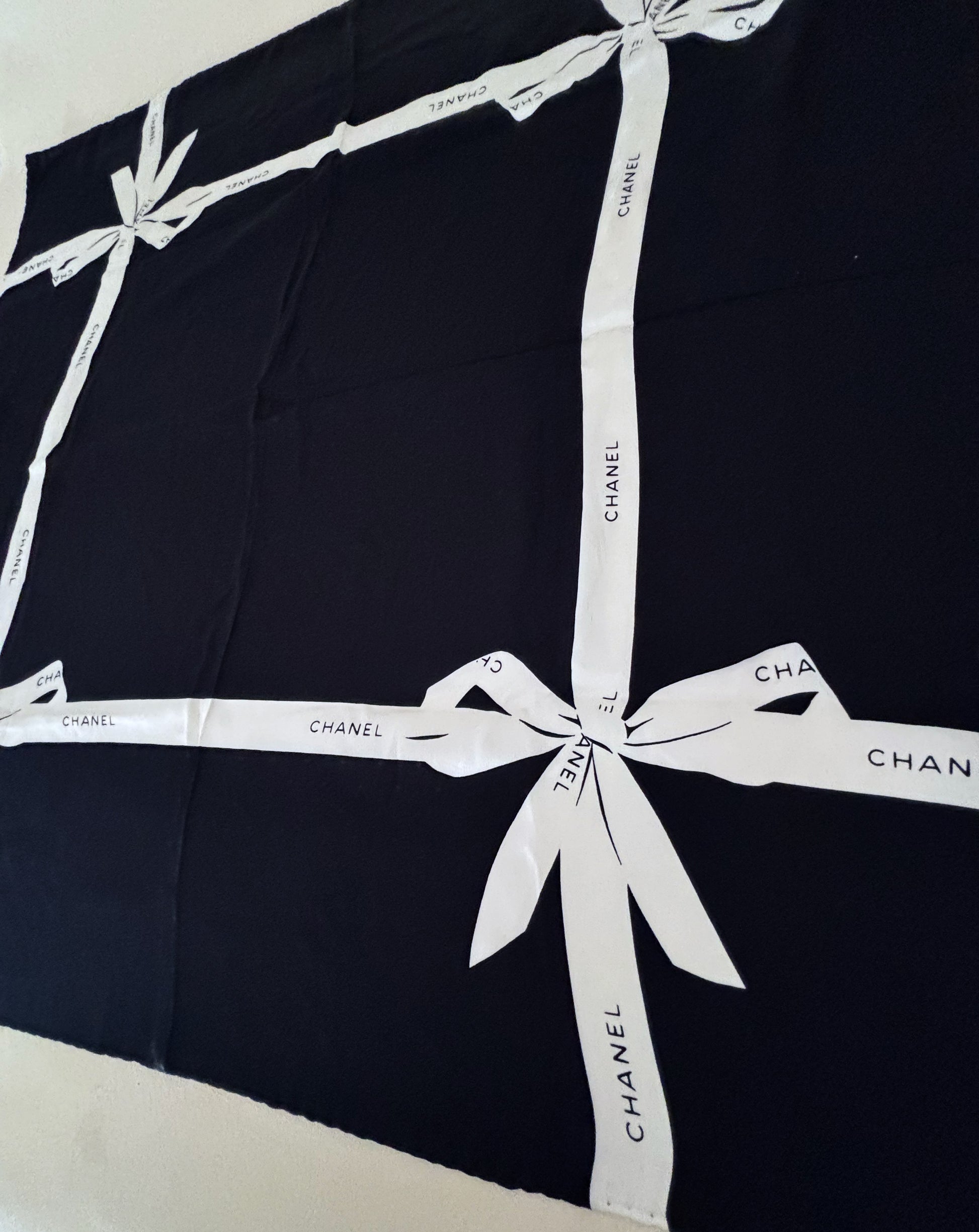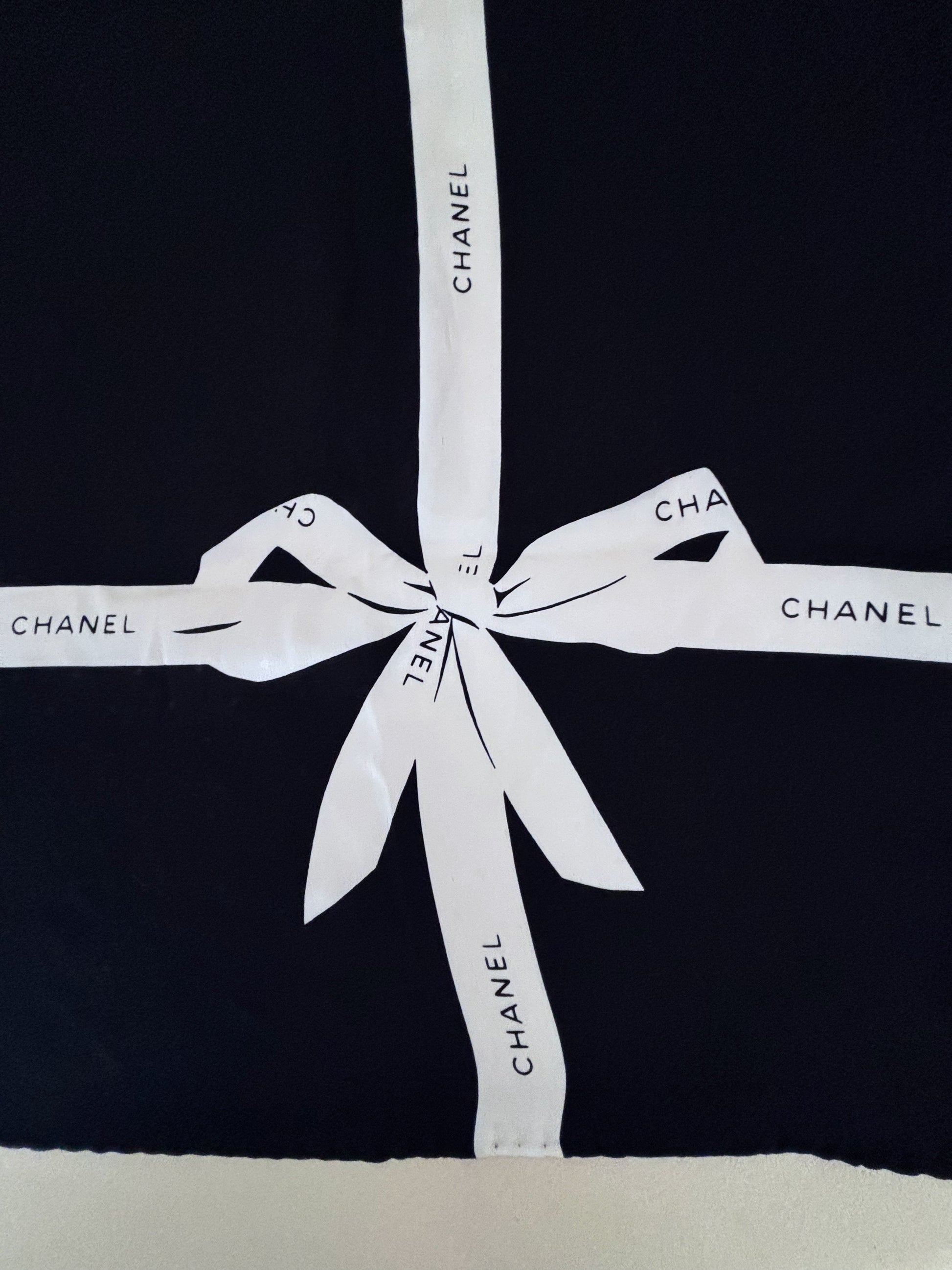* Motifs papier cadeau noir et ruban blanc avec le logo CHANEL contrastant