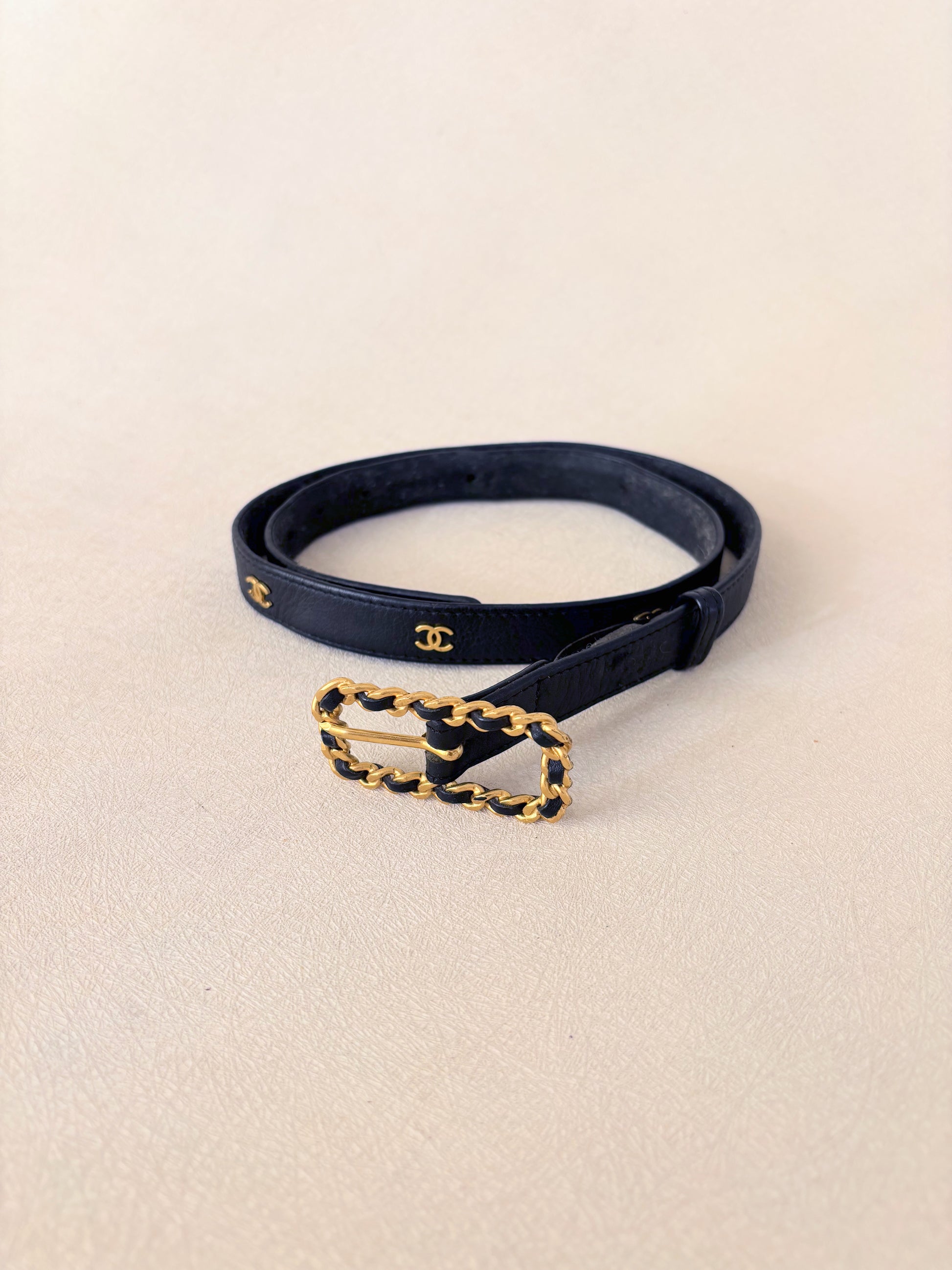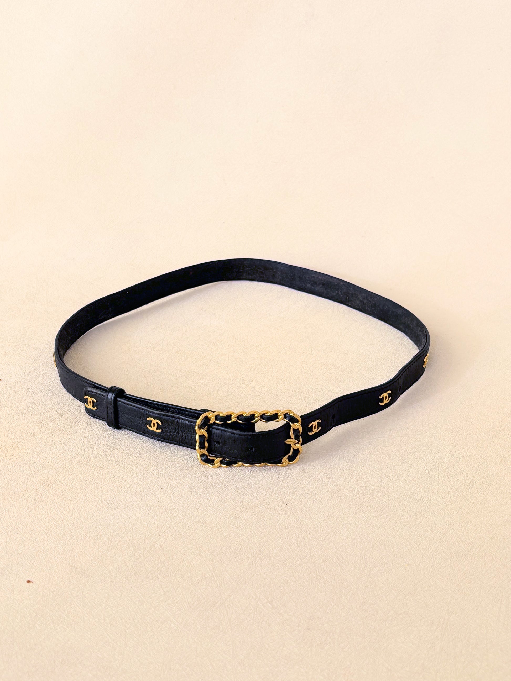 * Ceinture en cuir noir à boucle en métal doré entrelacé de cuir et logo CC doré
