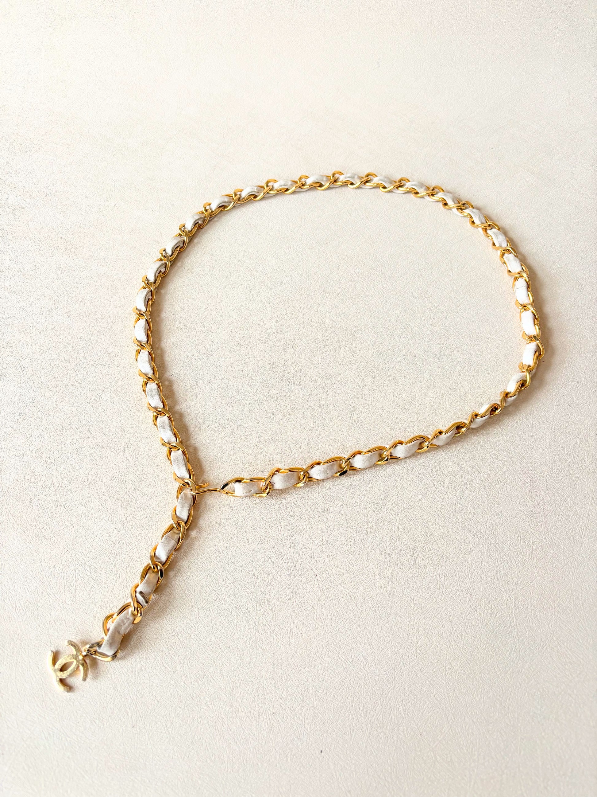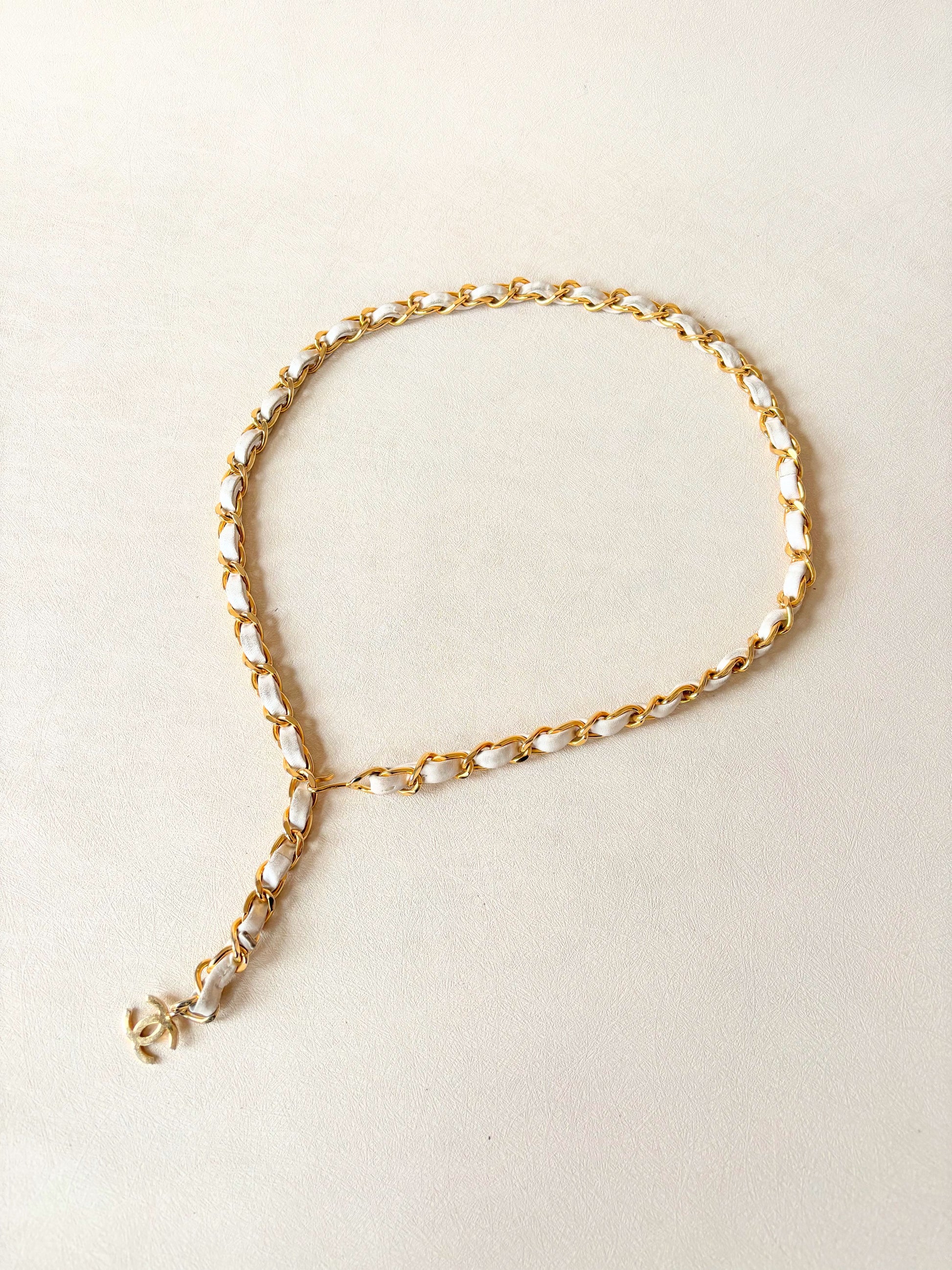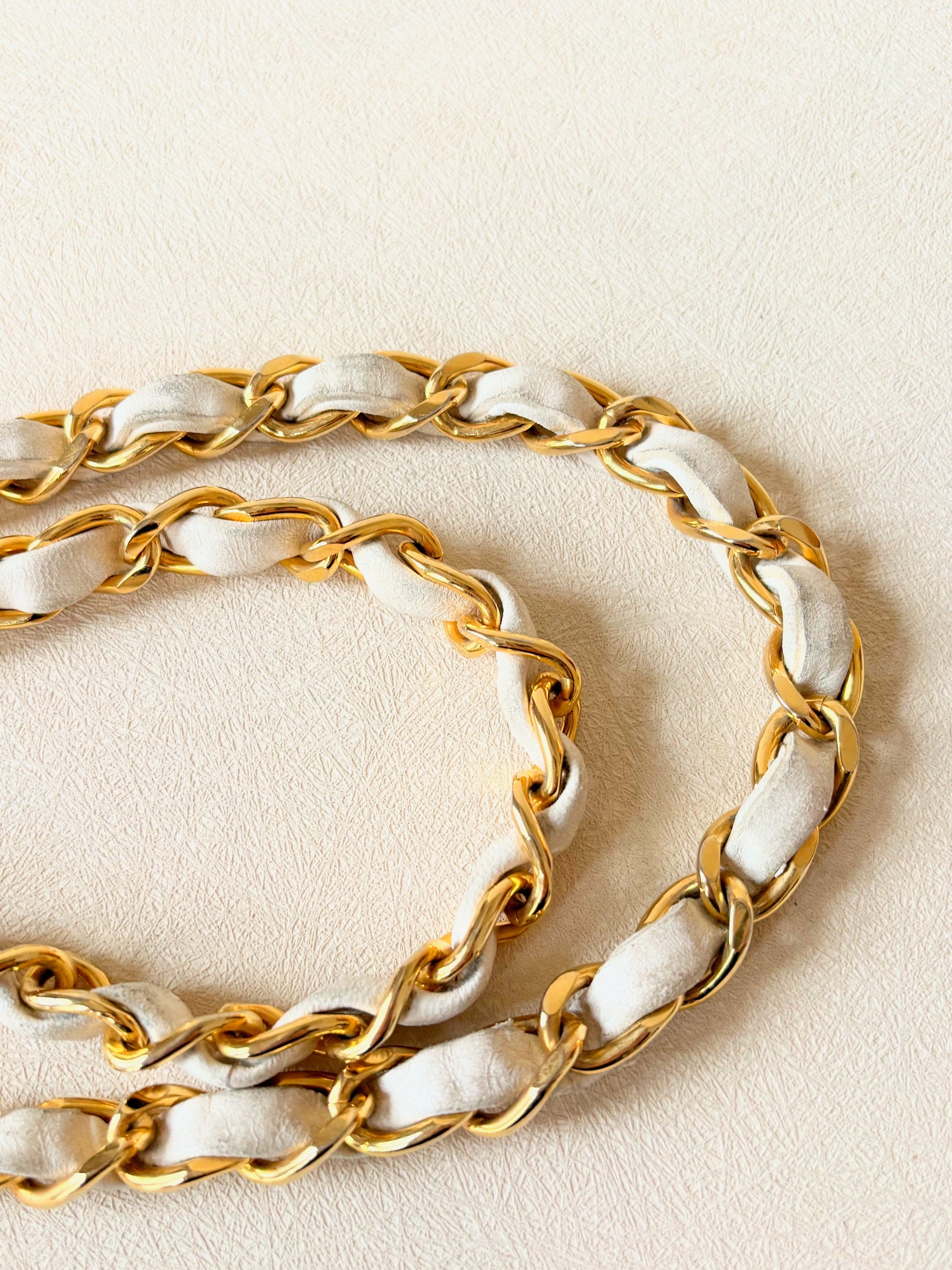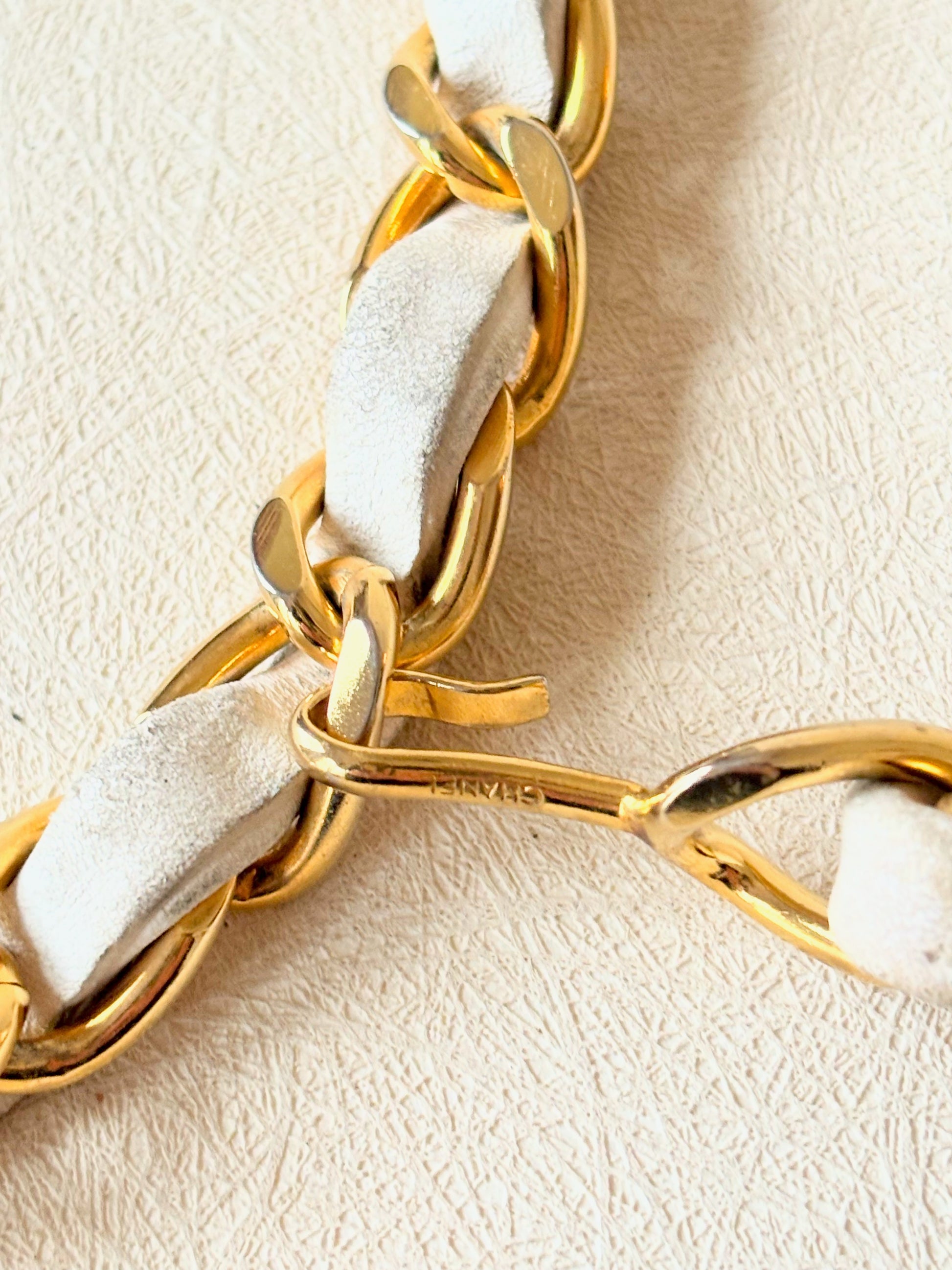 * Chaîne en métal doré entrelacé de cuir d'agneau crème, en bout le sigle CC en métal doré