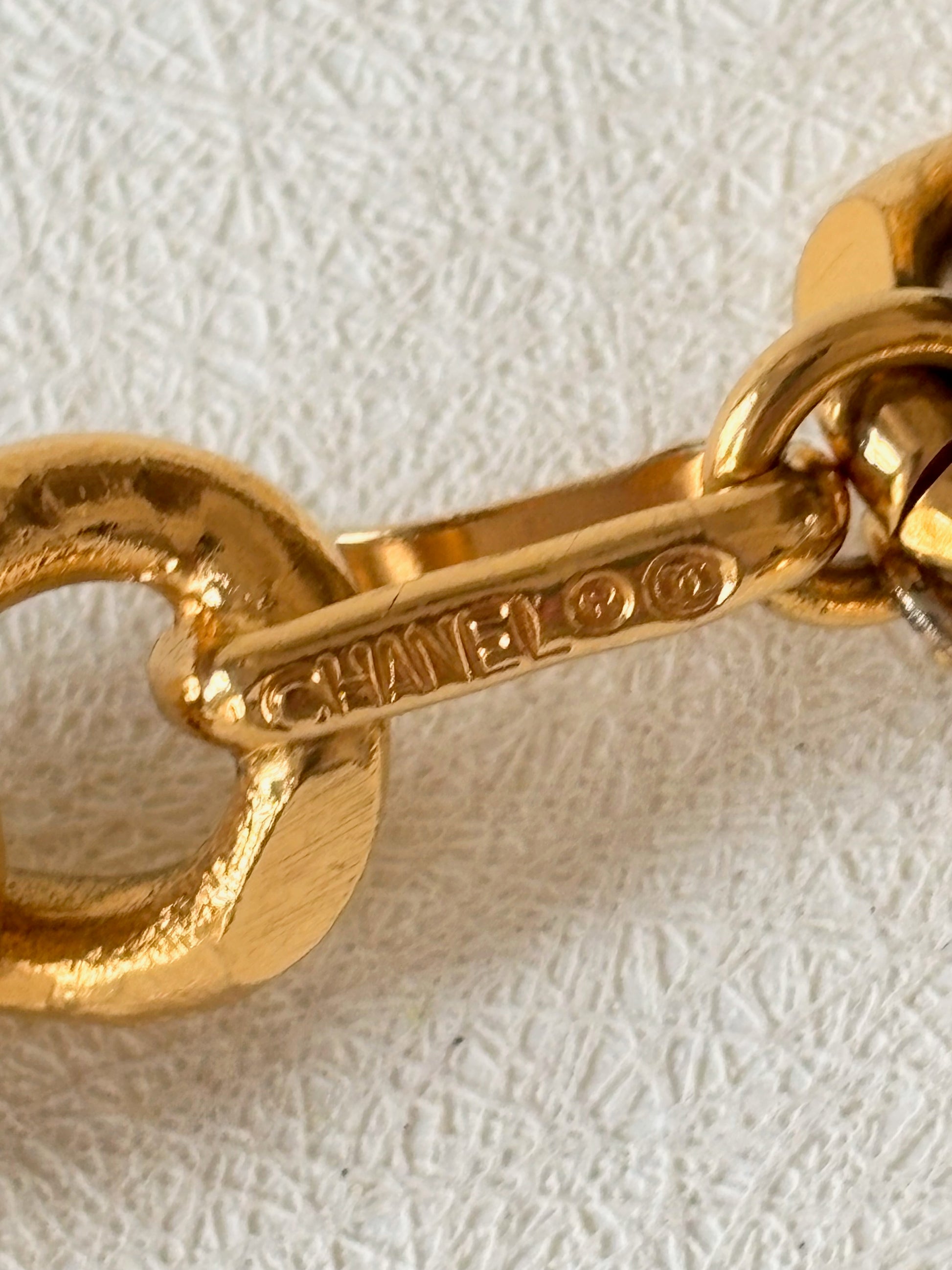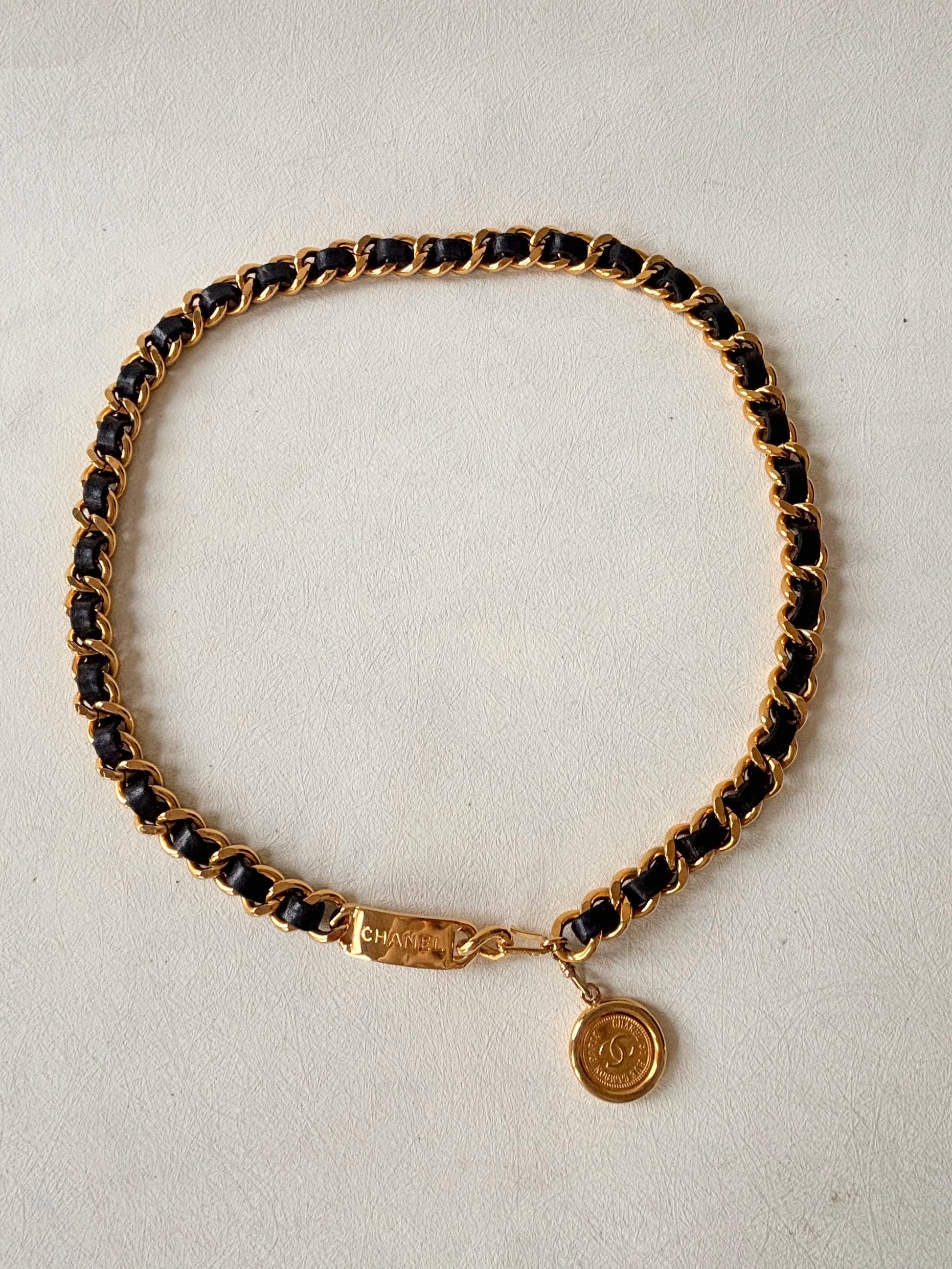 * Chaîne en métal doré entrelacé de cuir noir, médaillon CC en métal doré et plaque siglée CHANEL
