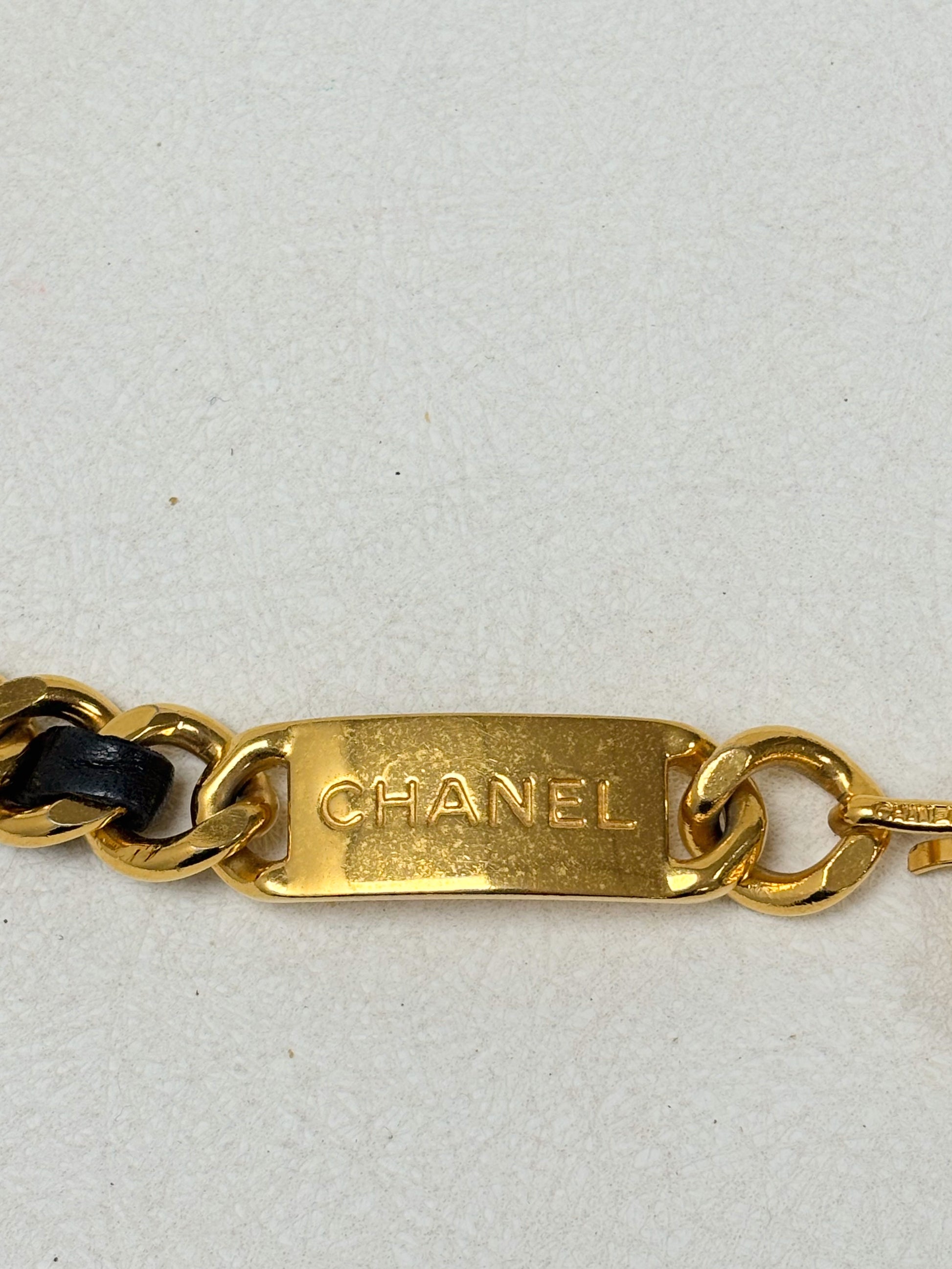* Chaîne en métal doré entrelacé de cuir noir, médaillon CC en métal doré et plaque siglée CHANEL