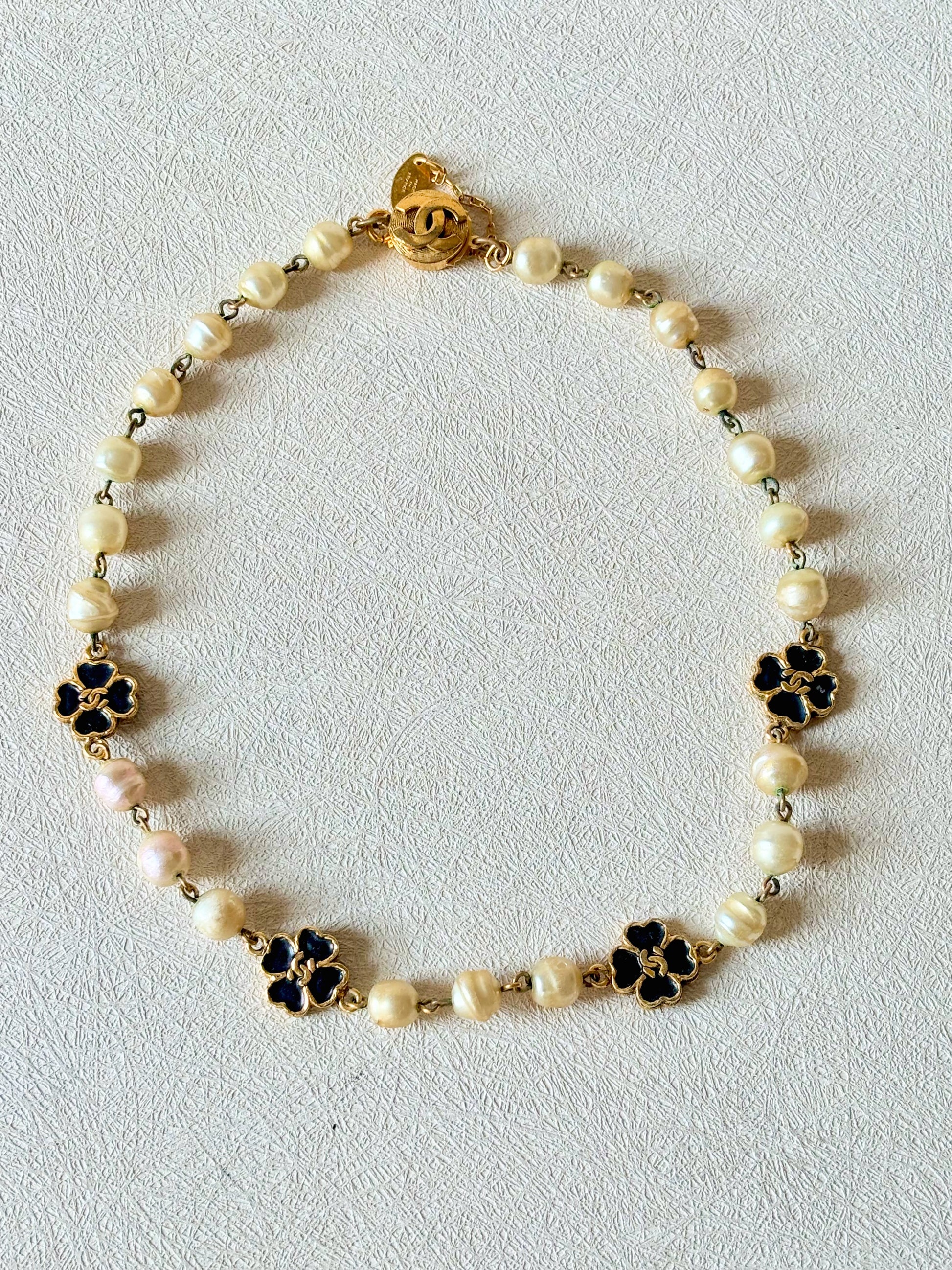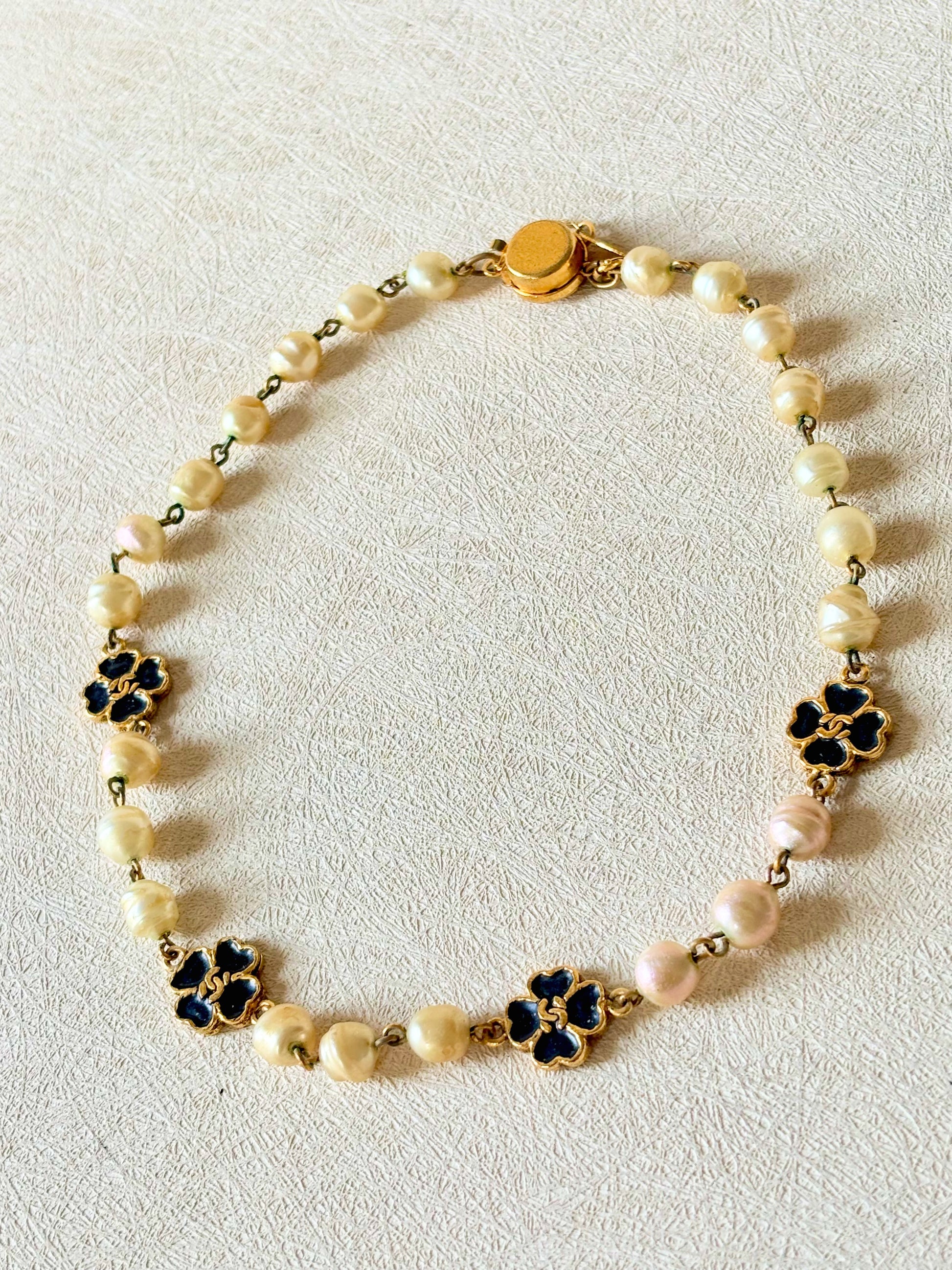 * Collier CHANEL en perles nacrées et trèfles noirs