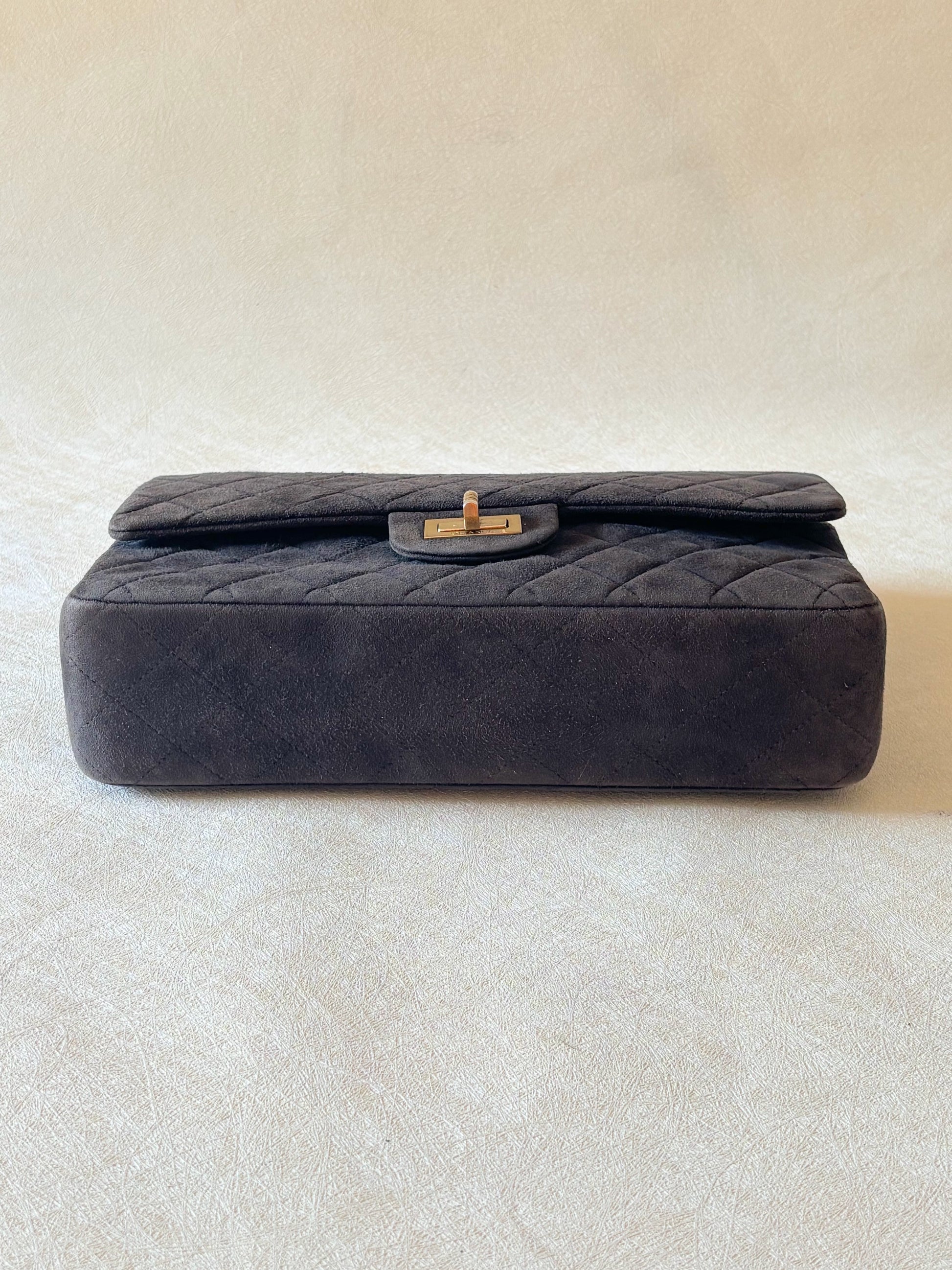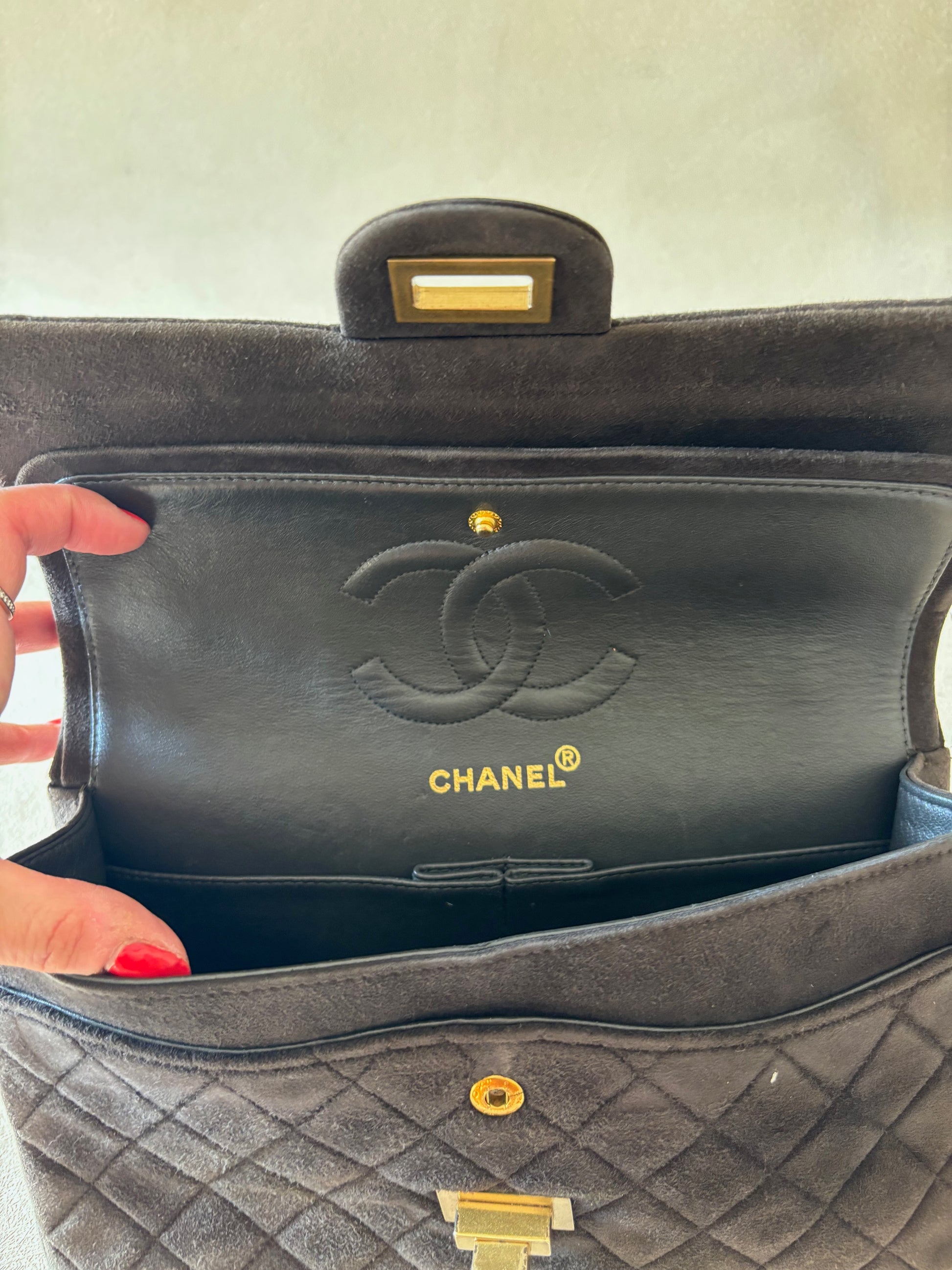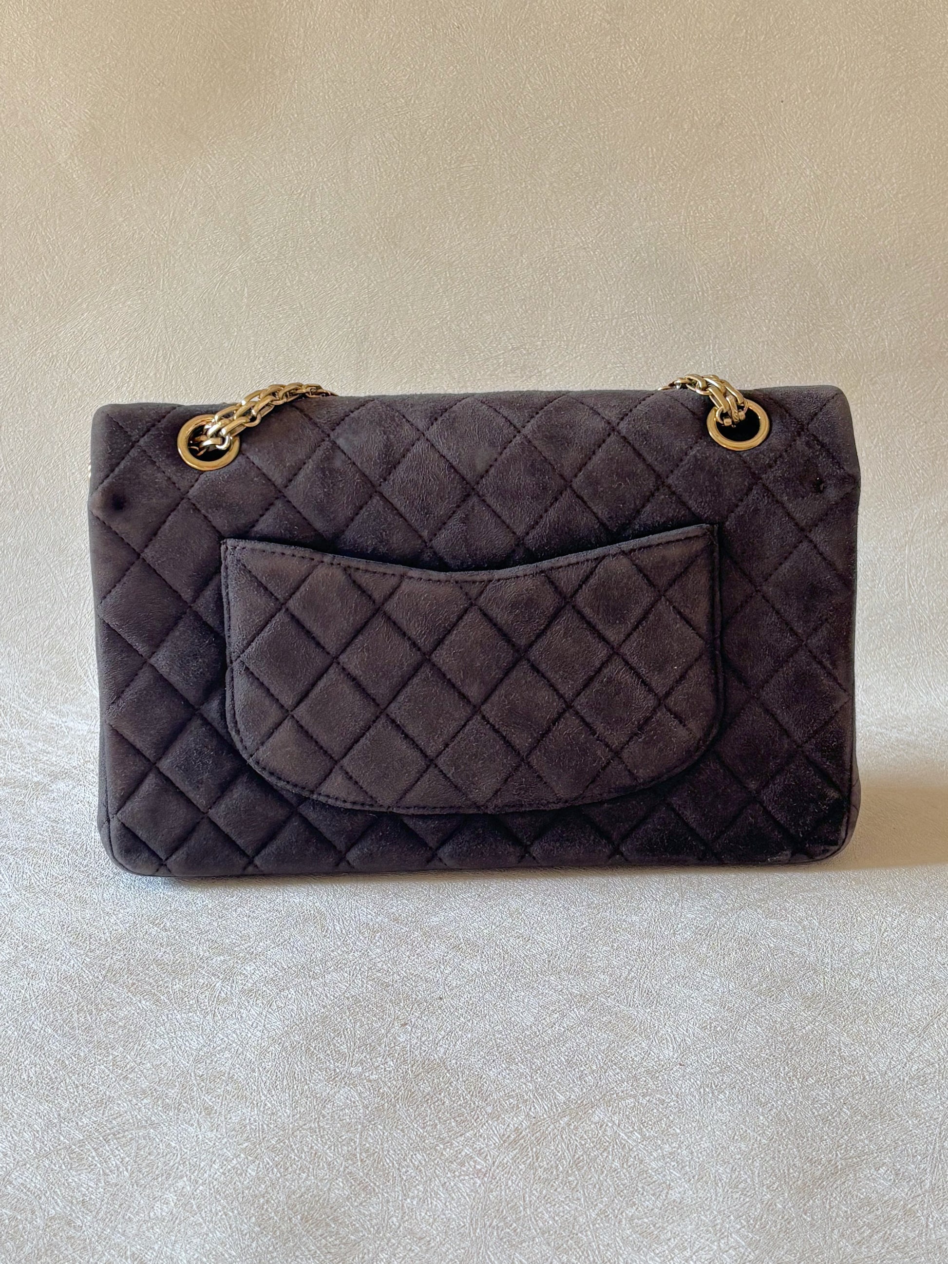 * Double rabat, intérieur en cuir marron ; une poche plaquée au dos du sac