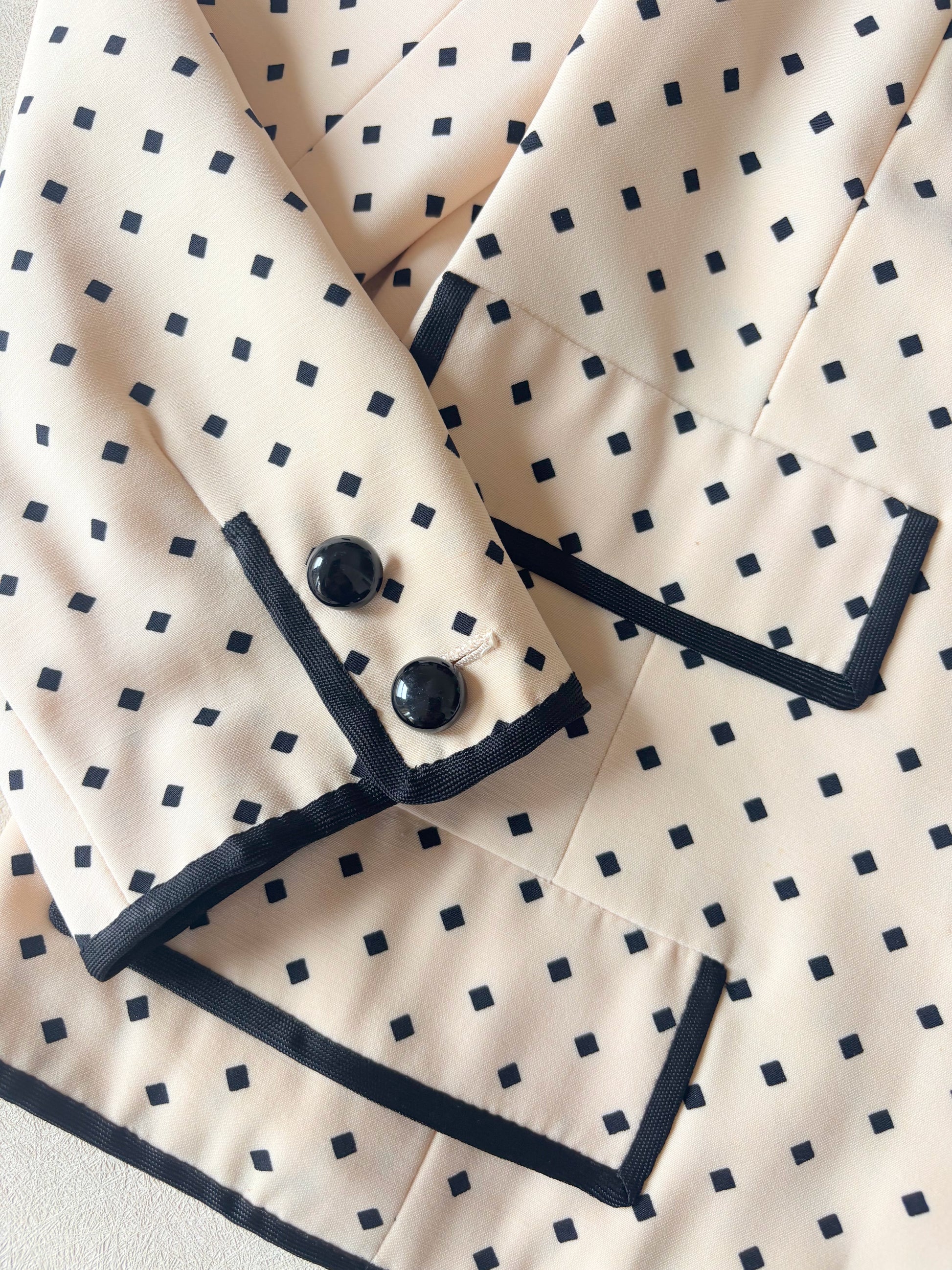 * Simple boutonnage à cinq boutons, rappel à la parementure au bas de la veste et du revers des quatre fausses poches