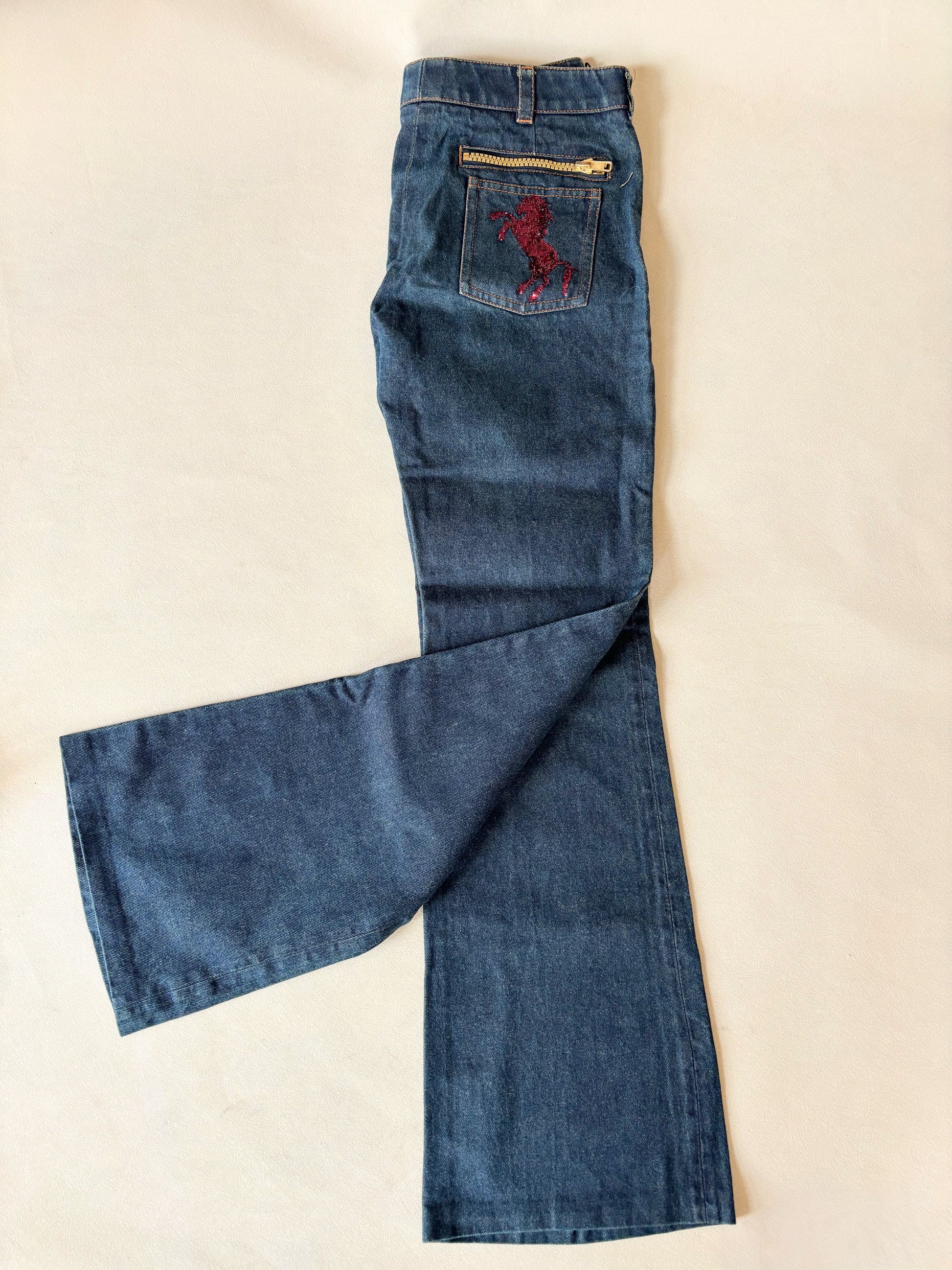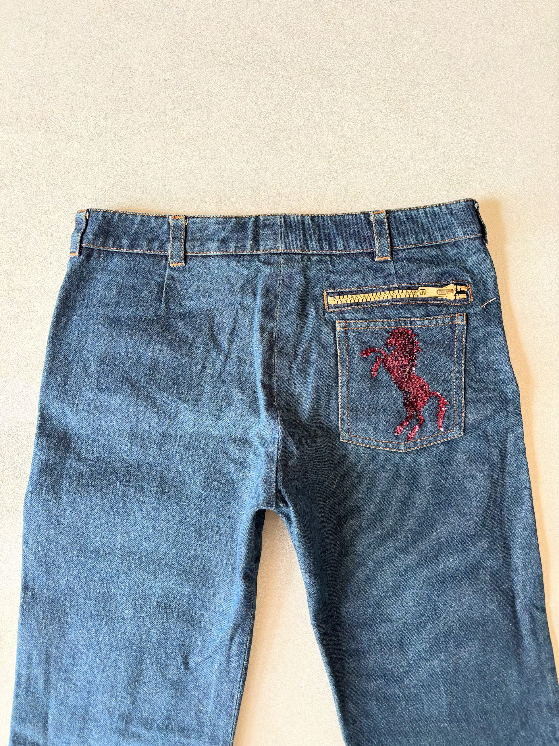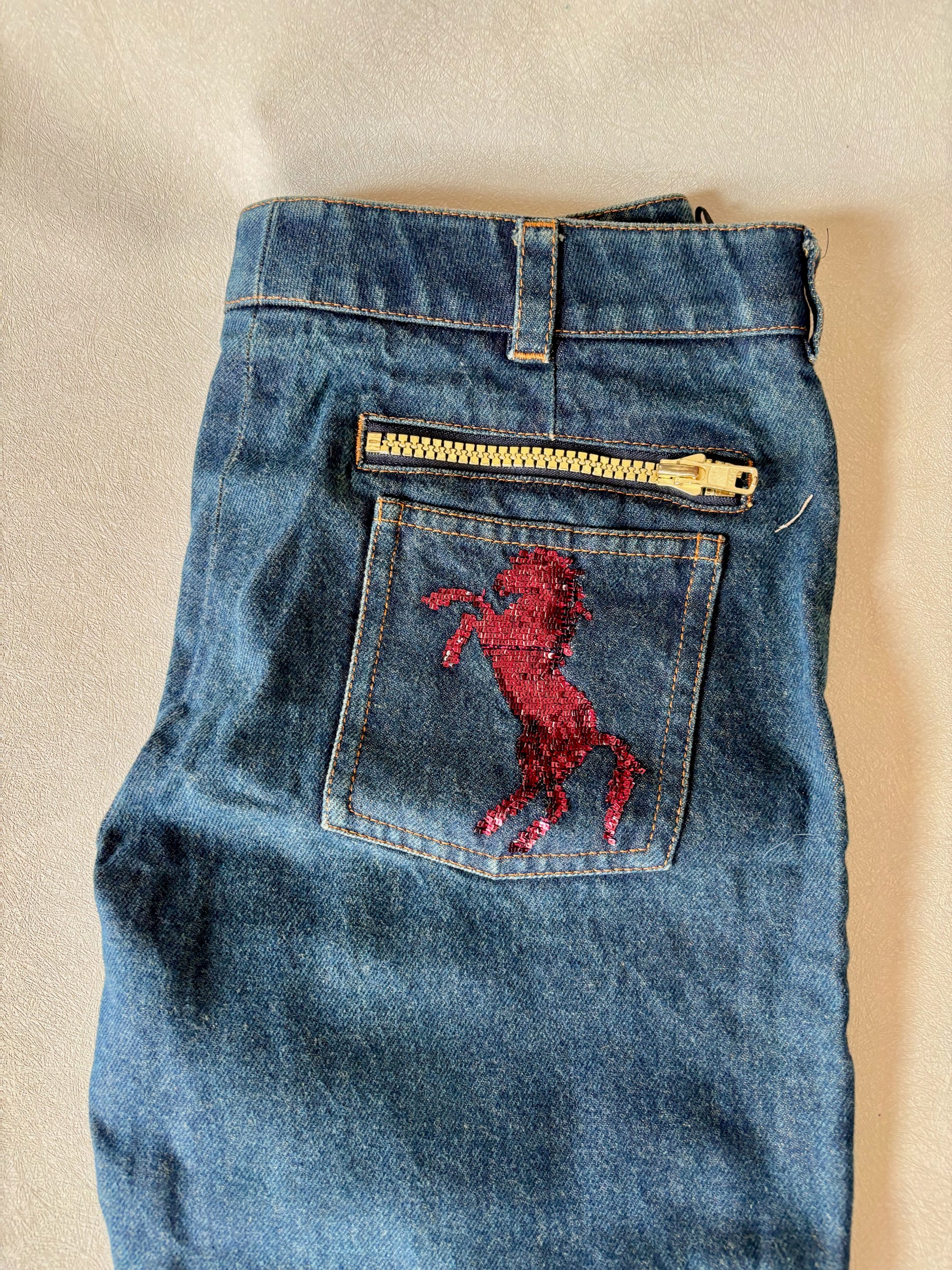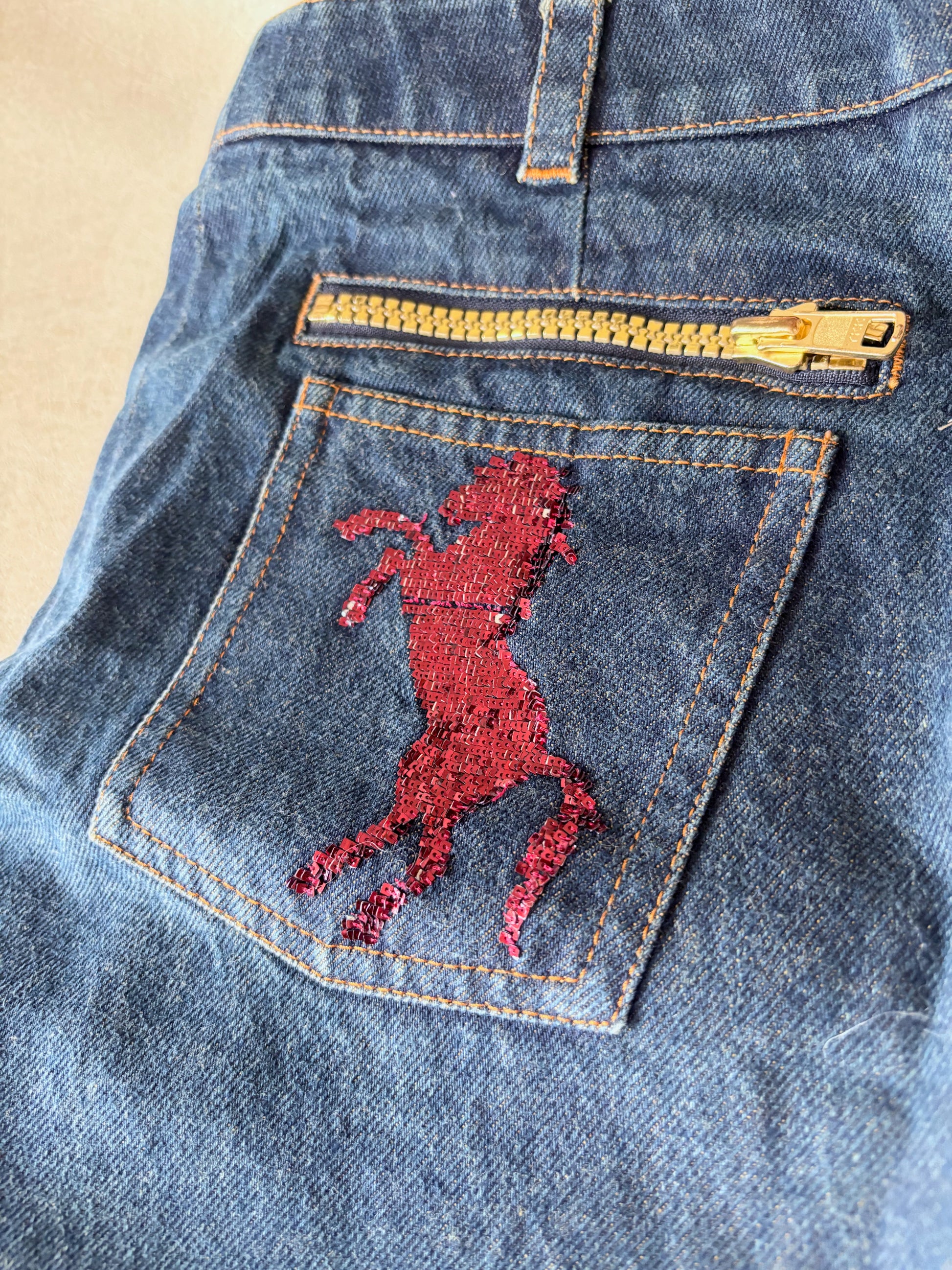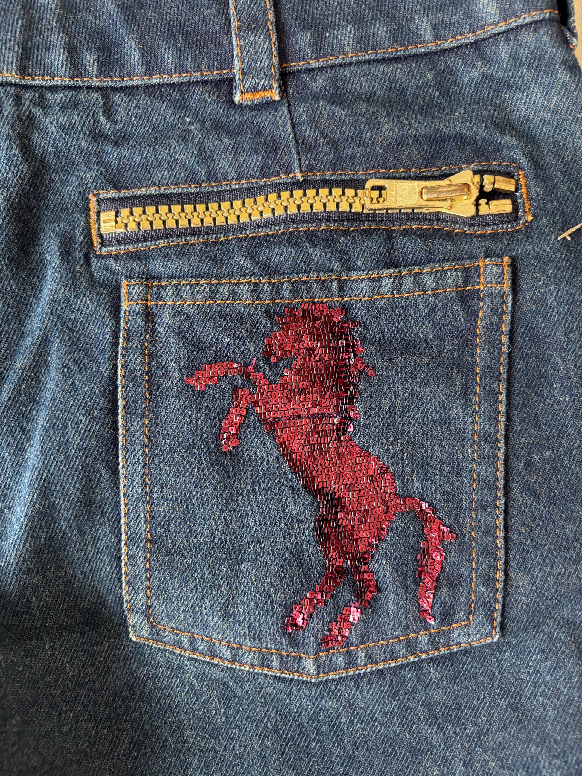 * En denim orné d'un cheval en sequins rouges brodé sur la poche arrière du pantalon