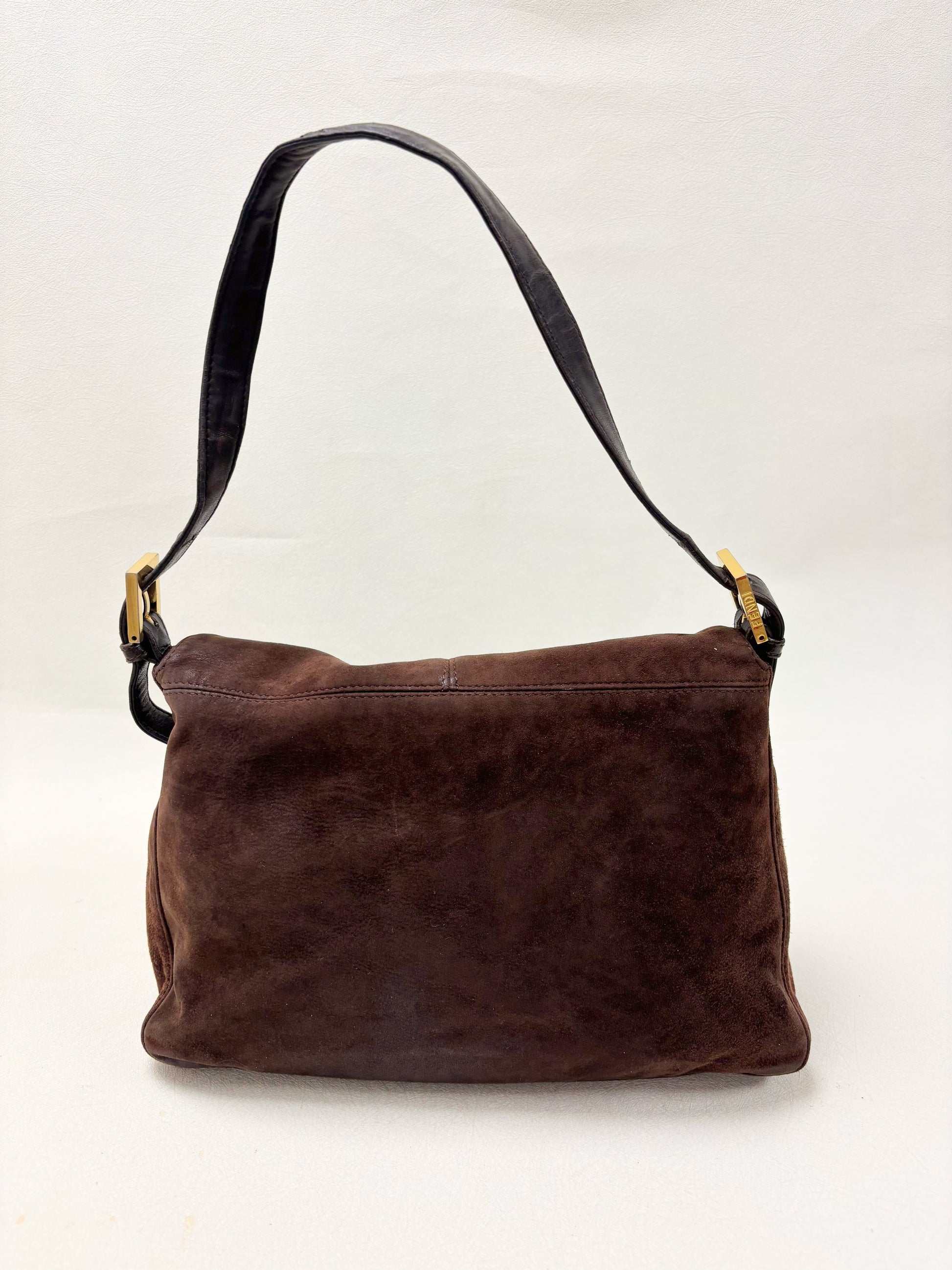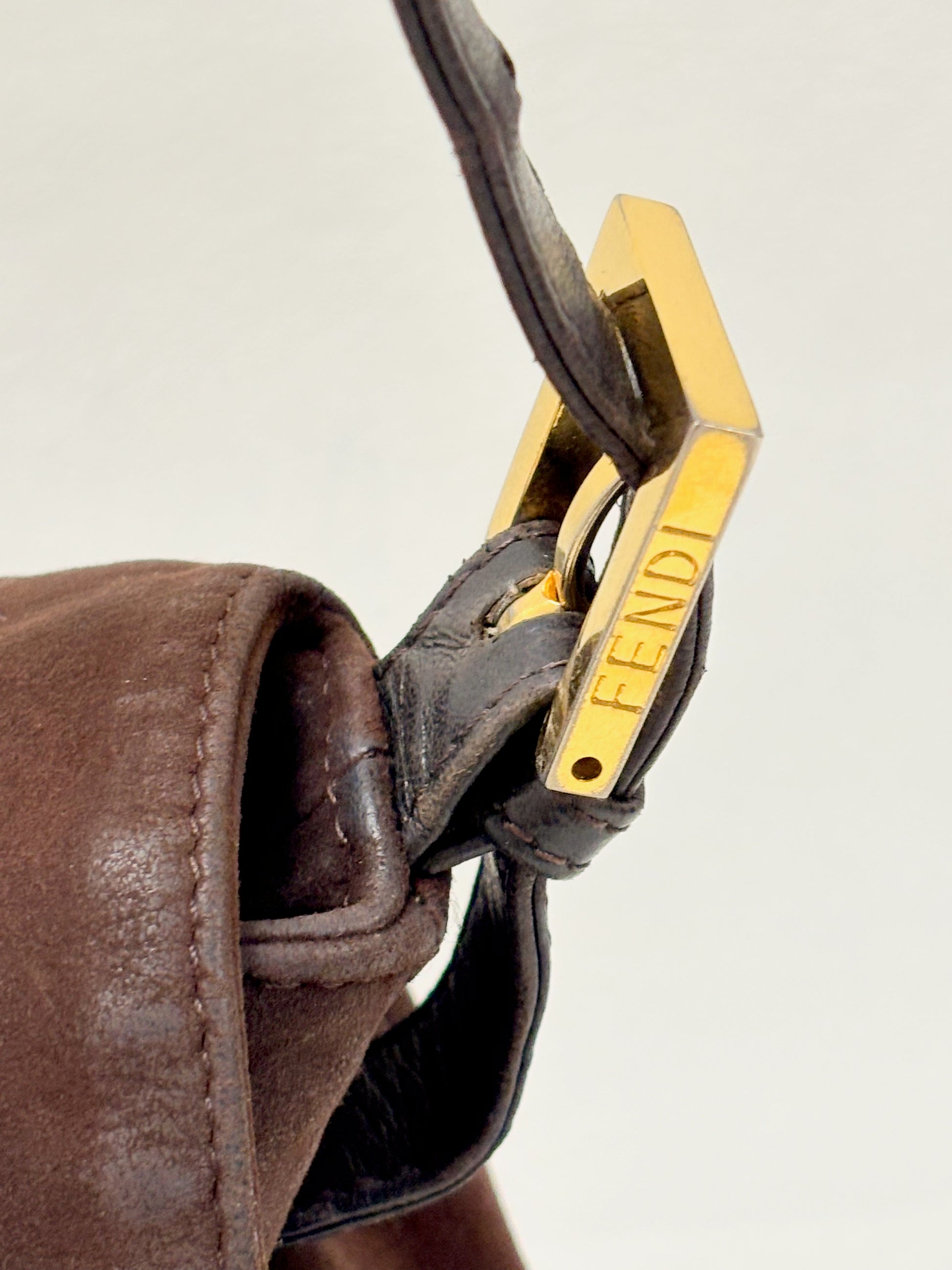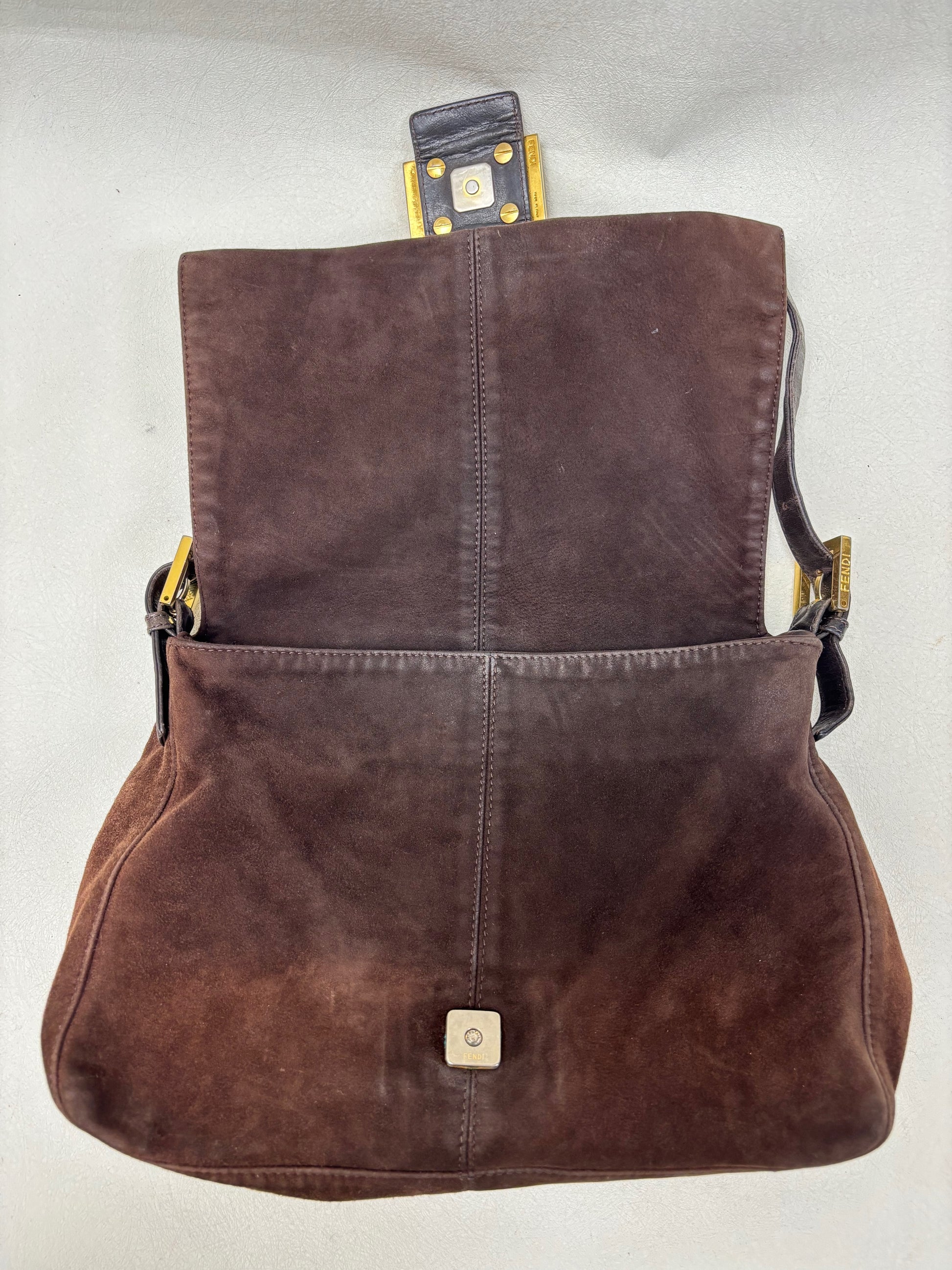 * Vintage en très bon état ; à noter, le daim est plus foncé sous le rabat ; le fermoir en métal doré est éclairci par endroits et la doublure en soie violette montre quelques signes d'usage sur les bords hauts.