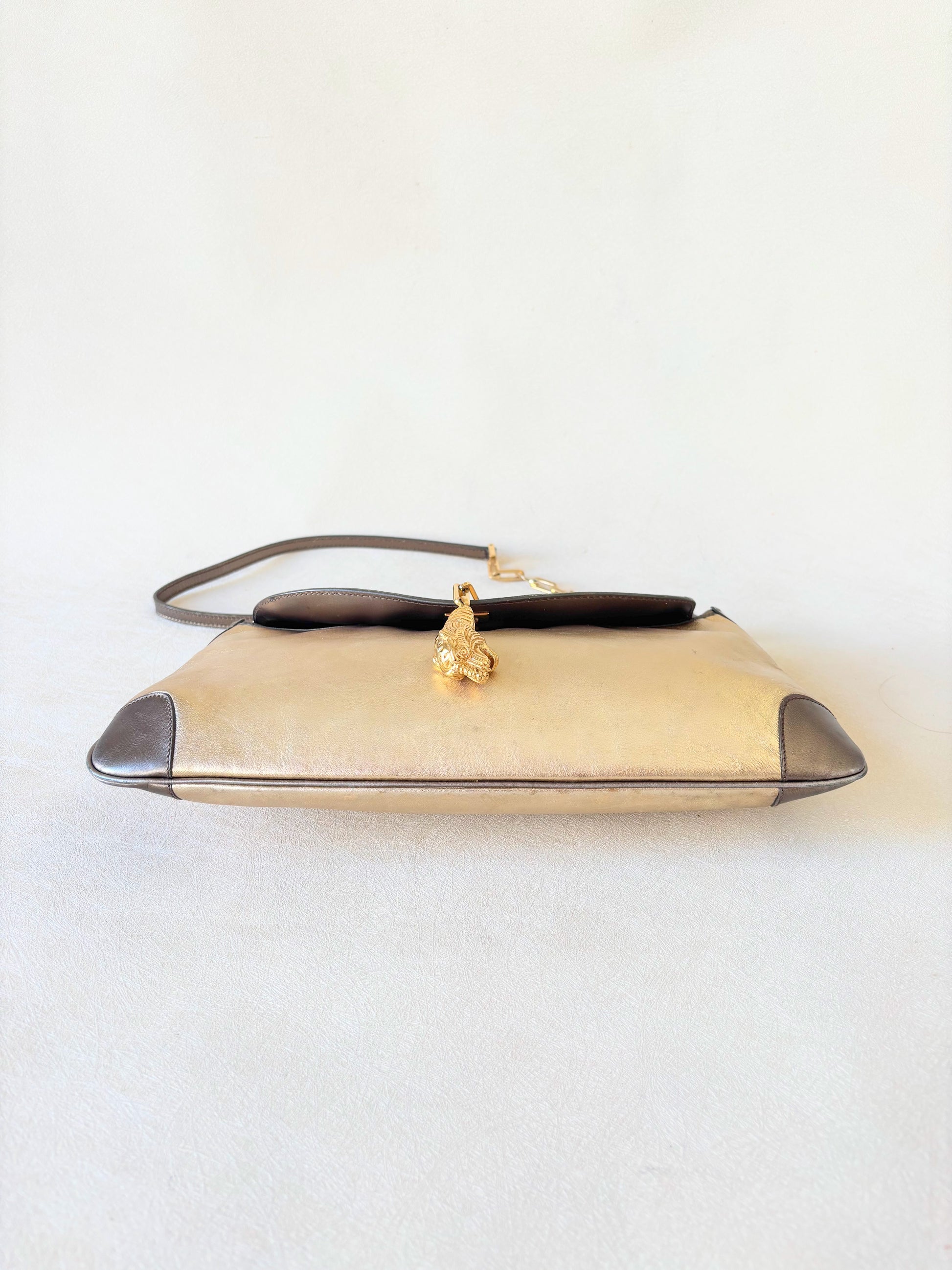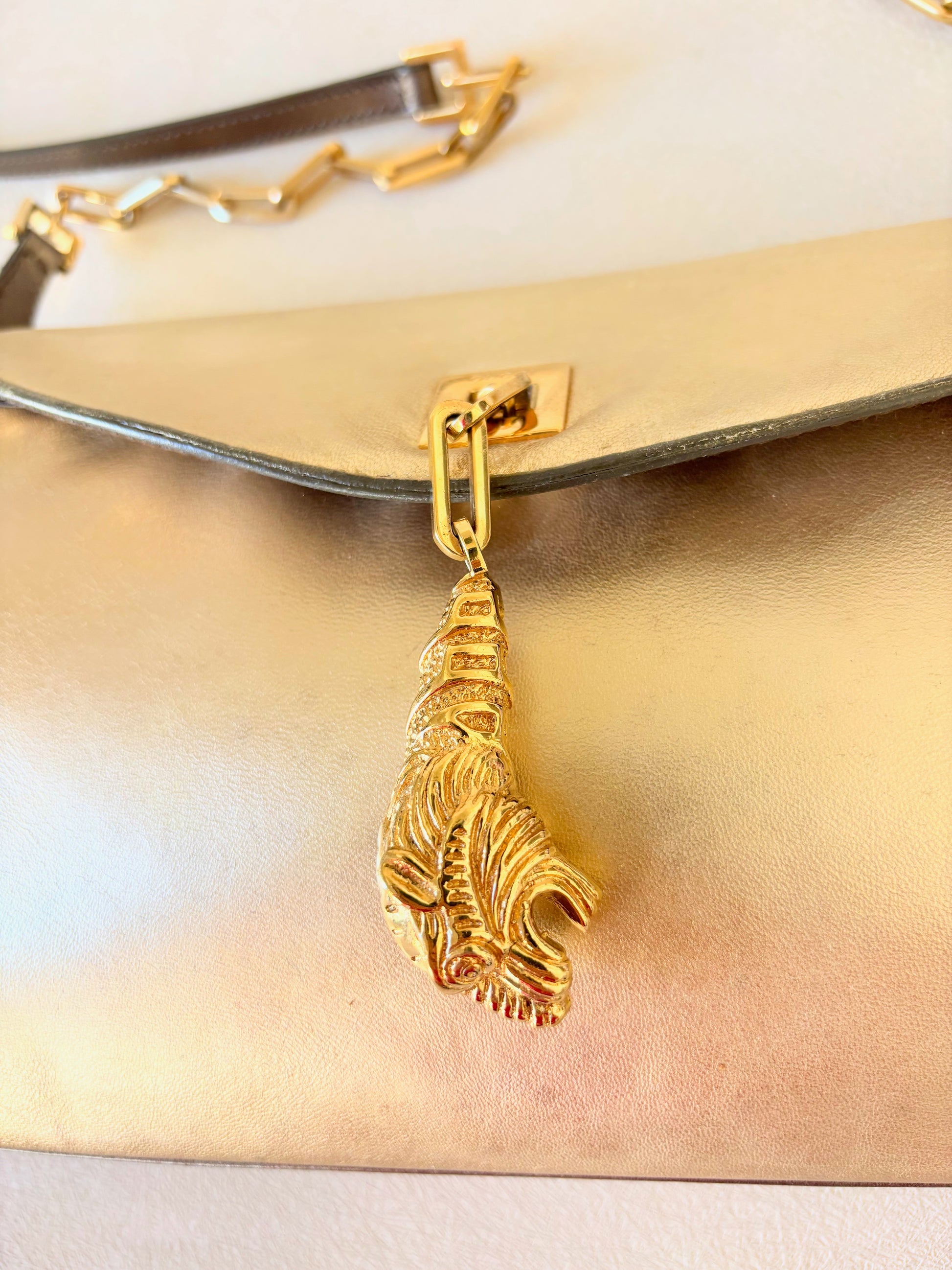 * Breloque tigre dorée sur le fermoir, bandoulière en métal et cuir dorés