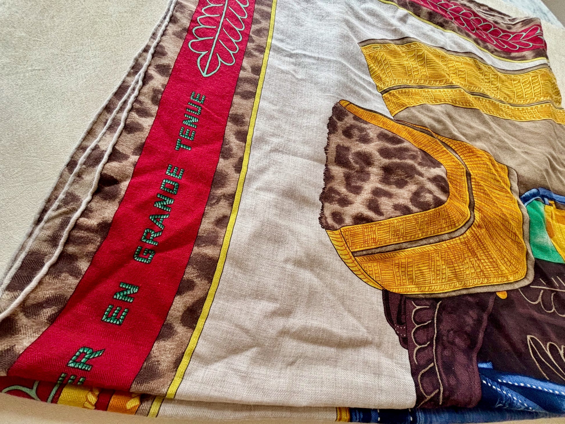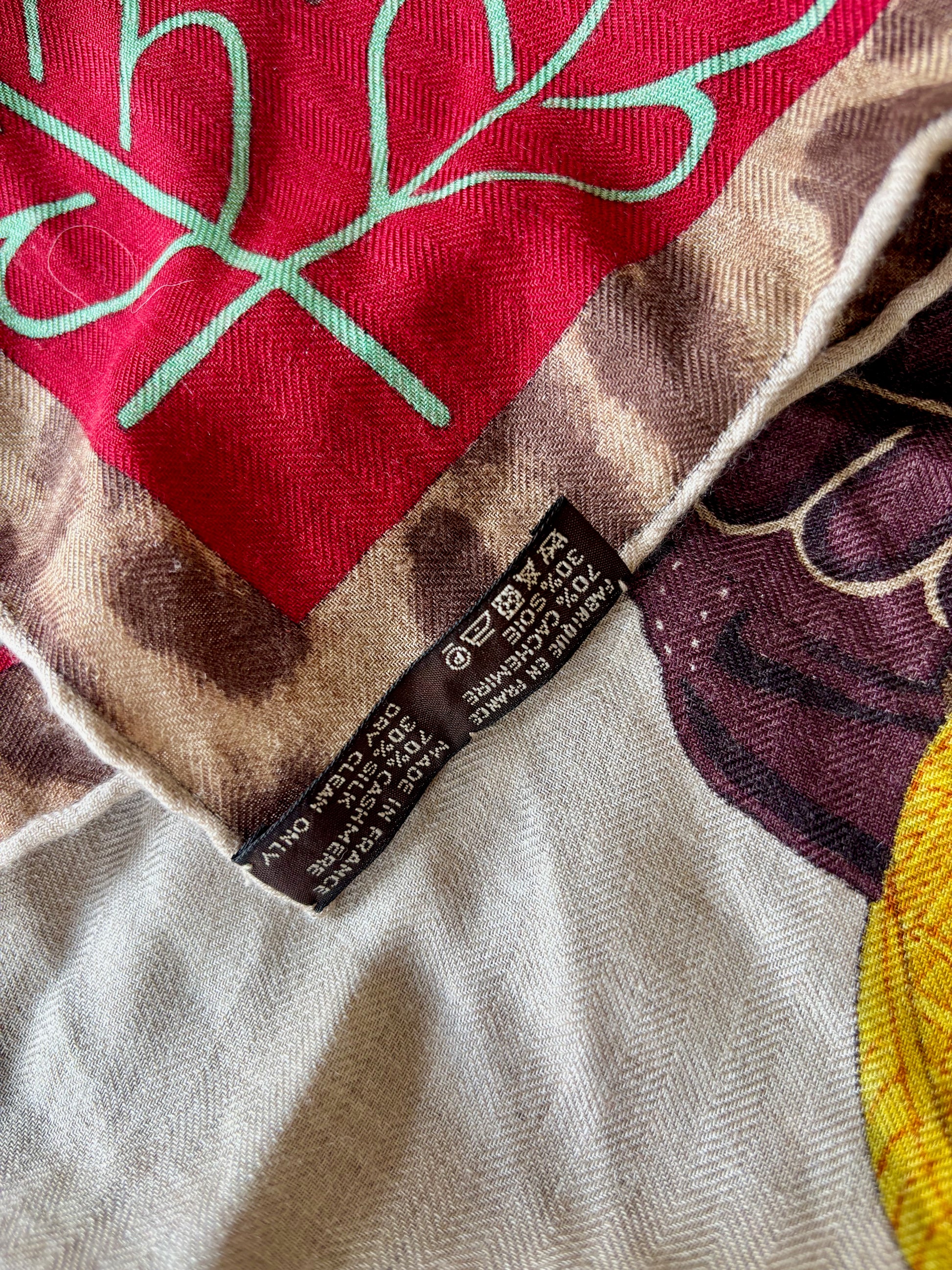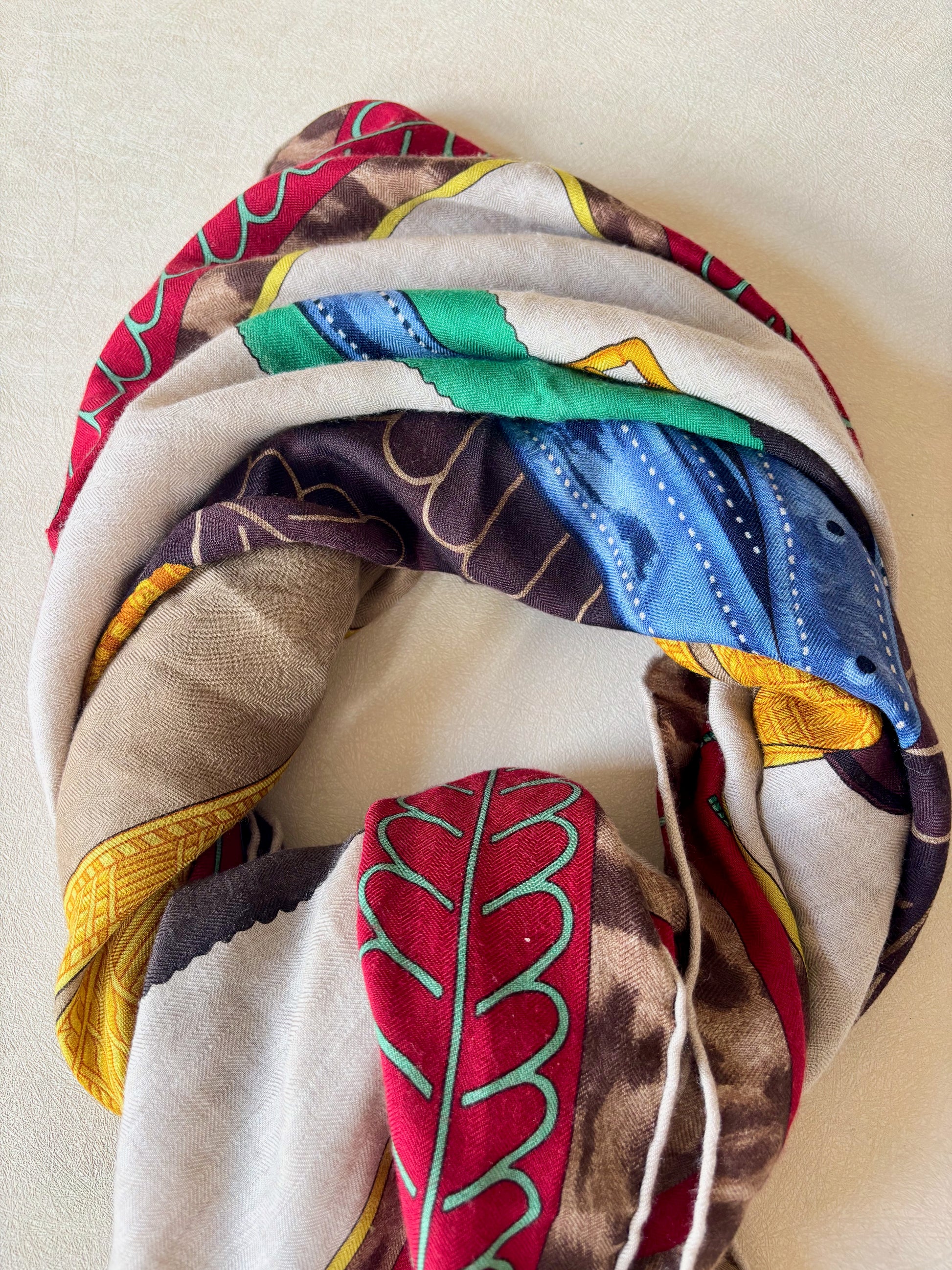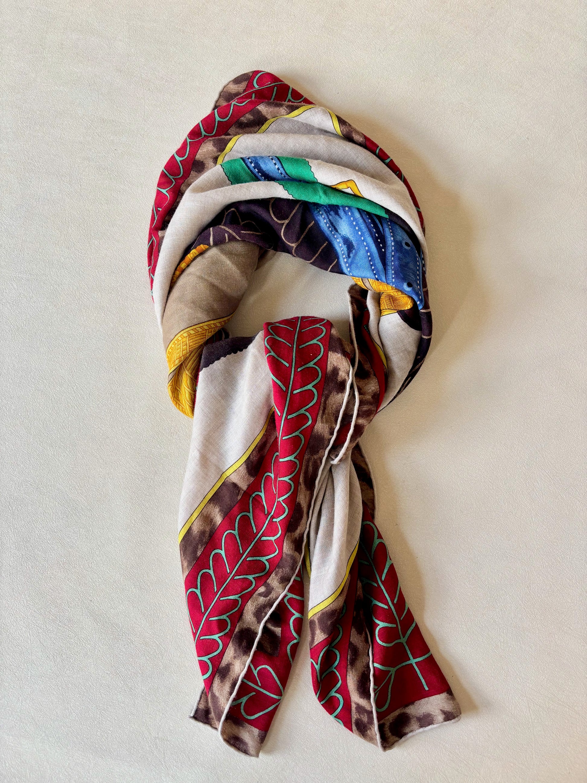 * Cachemire et soie roulottée à la main, multicolore aux tons chauds, bordures Léopard