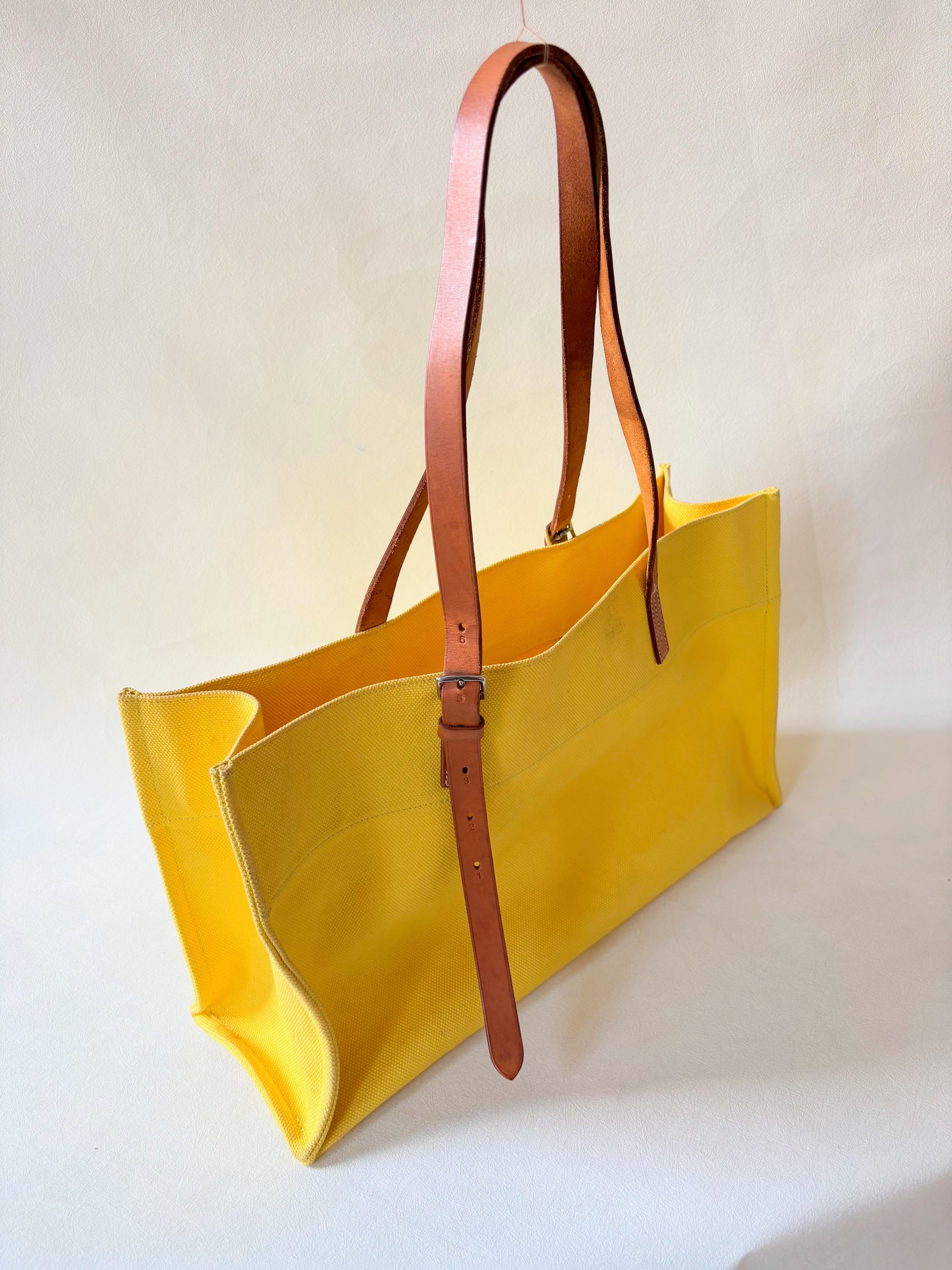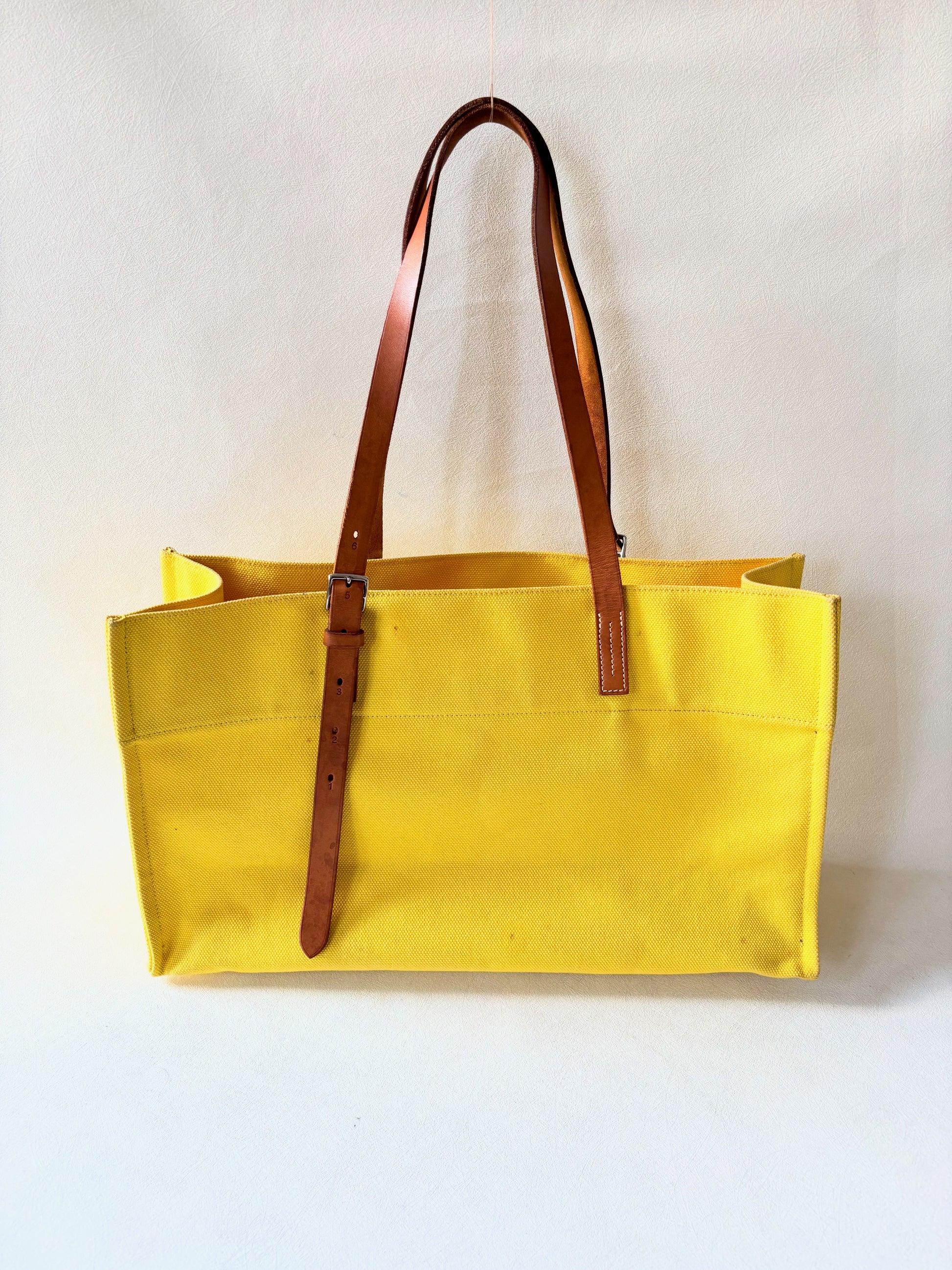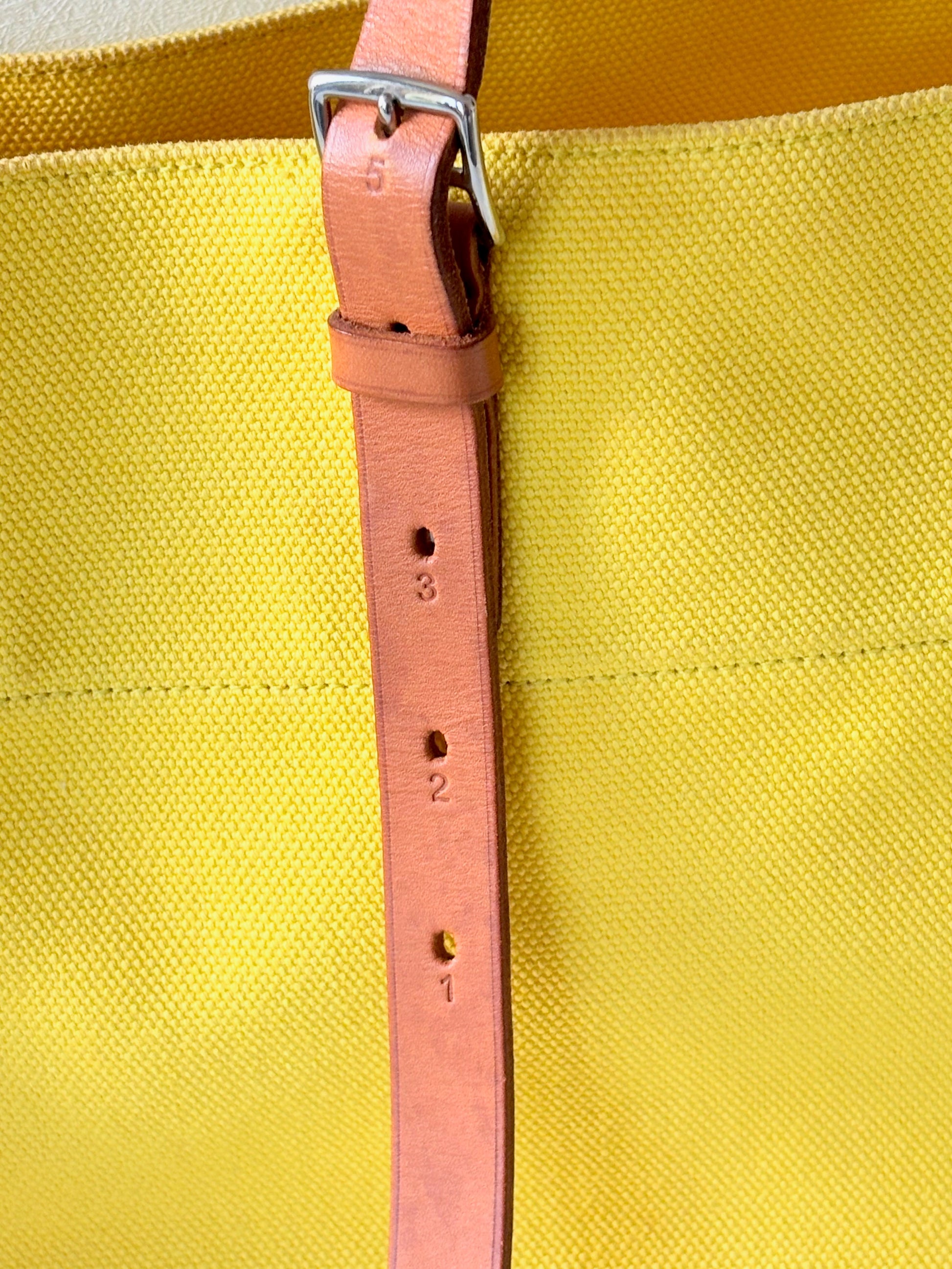 * Sangles en cuir camel surpiquée de fil de coton écrue, ajustables, pour un porté main ou épaule