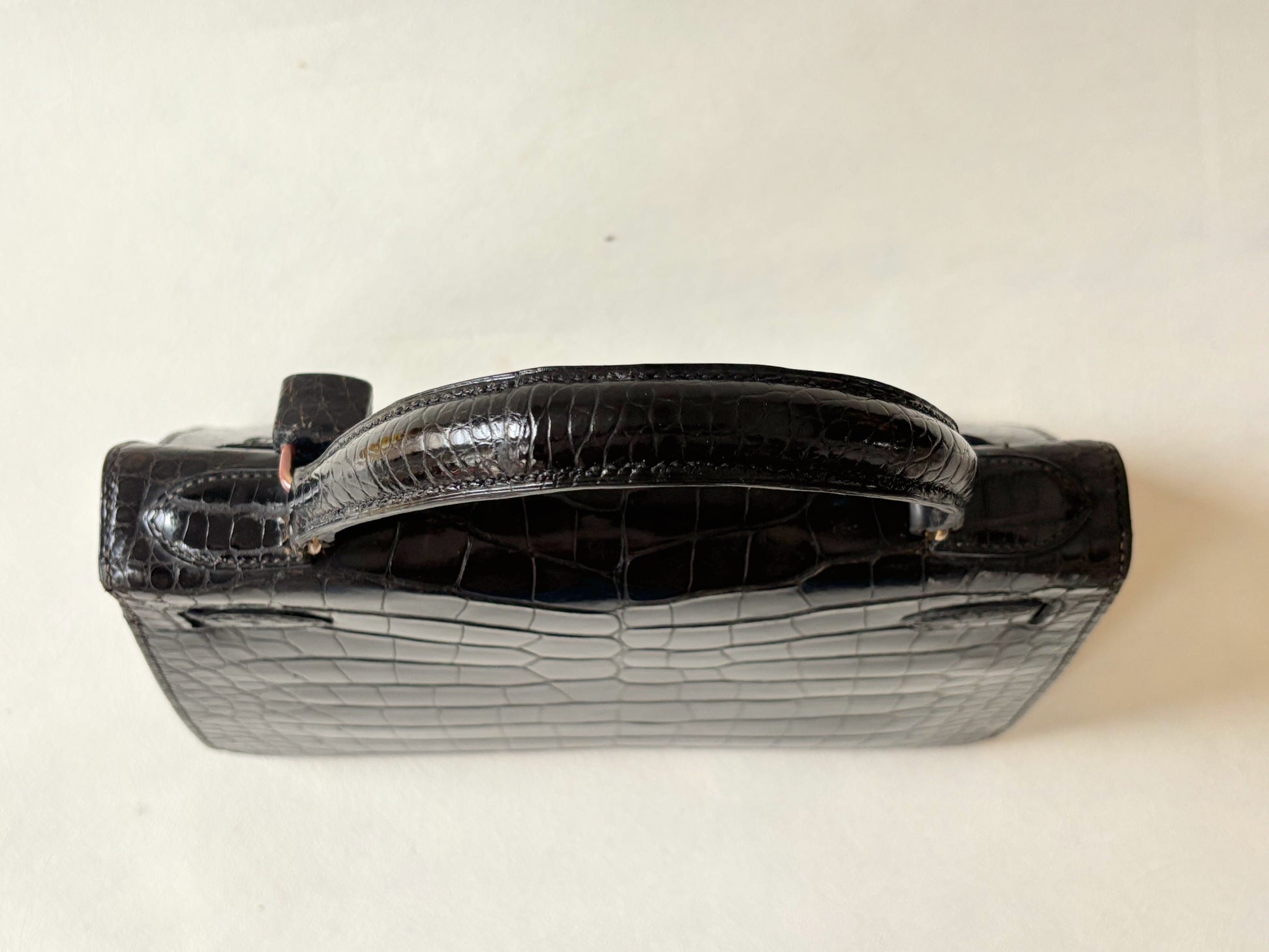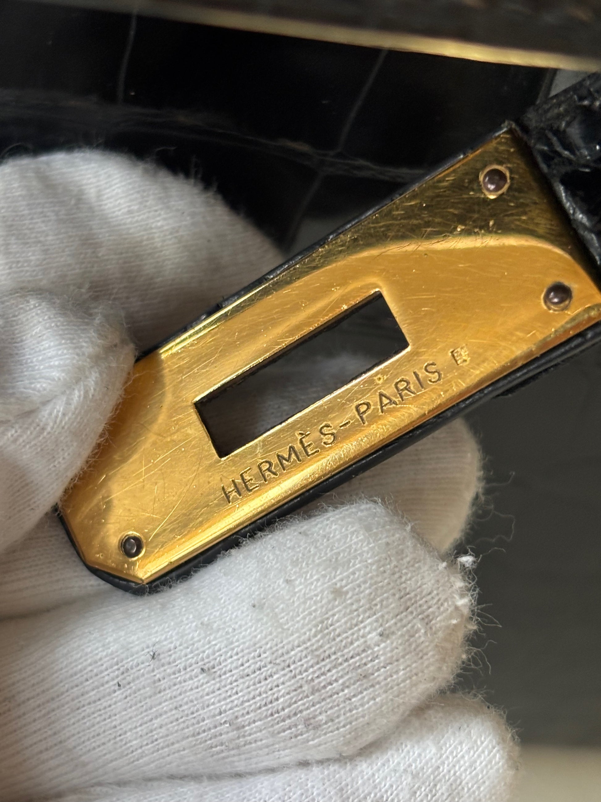 * Vintage en bel état : bel état de la dorure ; le cuir de crocodile est bien brillant et d'un noir profond ; à noter quelques manques de matière au niveau des angles ; le cuir de la clochette est fragile
